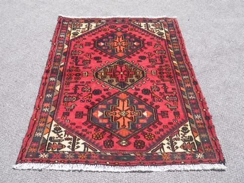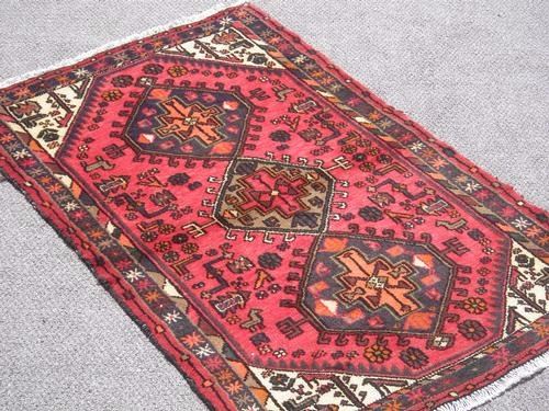 HIGHLY DETAILED HAND WOVEN PERSIAN HAMADAN. SIZE 4.10 X 3.2 FEET, MADE OF FINE QUALITY BABY LAMB'S WOOL PILE ON COTTON FOUNDATION, ALL NATURAL VEGETABLE DYE, INCORPORATING A FREE FLOWING FLORAL AND TRIBAL PATTERN ON ABRASH RED BACKGROUND, WITH A ROW OF THREE LARGE MEDALLIONS, CROWNED CORNERS AND AN INTRICATELY DETAILED FLORAL AND GEOMETRIC MULTI LAYERED BORDER. FOUR LEGGED ANIMALS, BIRDS, TREES AND FLOWERS ARE POPULAR ELEMENTS ON THIS KIND OF DESIGN. HAND WOVEN IN HAMADAN, Iran.