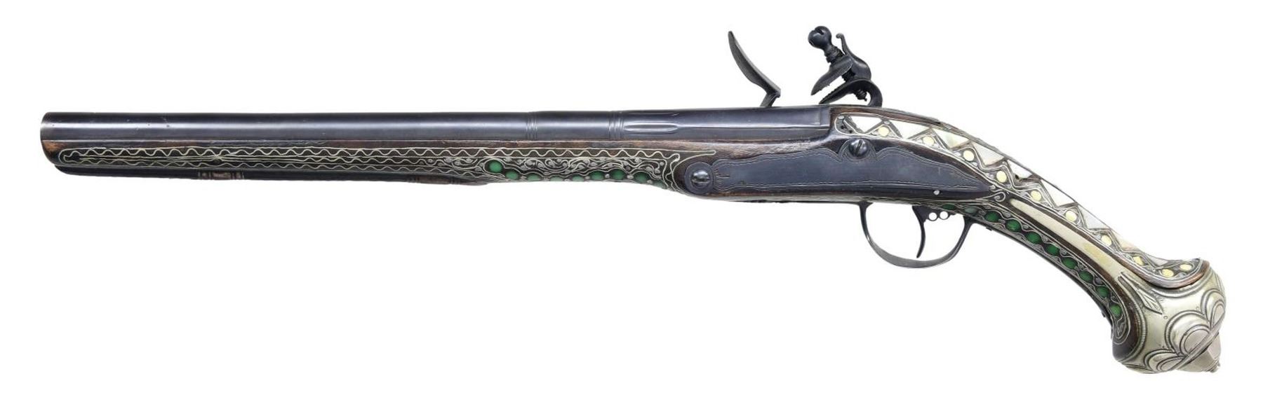 Cal. 65. NSN. Bbl. 13 1/8". Attractive Ottoman flintlock pistol produced by an unknown mfg. Lockplate, swan neck cock, frizzen, and bbl. tang exhibit decorative foliate engraving, with the lockplate also exhibiting an indiscernible maker mark at the center. Iron bbl features an octagonal breech, which terminates in a tradition rnd. bbl. Cock screw and pan exhibit light gold embellishments. Iron components including the lockplate, cock, bbl., sideplate, trigger guard, and trigger exhibit a blue finish overall. Full length wood stock features a faux ramrod and is highly decorated in silver inlaid wire, triangular pearl panels, as well as green and red circular inlays. Stock is fitted with a silver ball butt, that features a multi-faceted pommel. CONDITION: iron components retain the majority of their blue finish overall, exhibiting some spots of mild wear and thinning that show through to gray and brown patinas. Silver butt and wire inlays show appropriate age related discoloration overall. Action holds on cock, half cock, and functions appropriately when cycled by hand. Stock exhibits a crack between the rear of the trigger guard tang and butt, with a few losses to the inlays, but otherwise remains sturdy and serviceable. Butt exhibits some separation on the right side, with a few scattered spots of the inlaid wire having come slightly loose. (01-24392/MLW). ANTIQUE. $700-900.