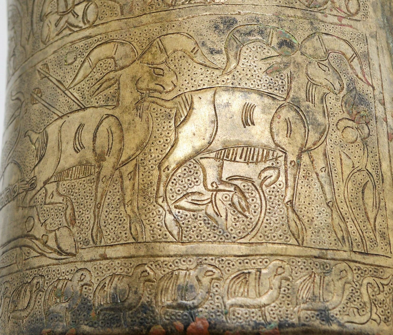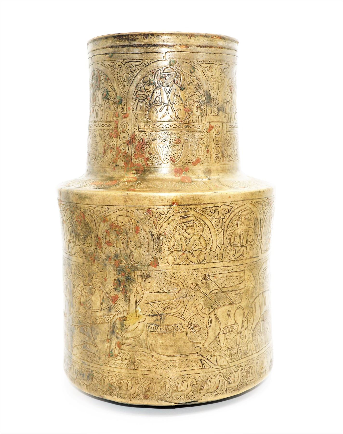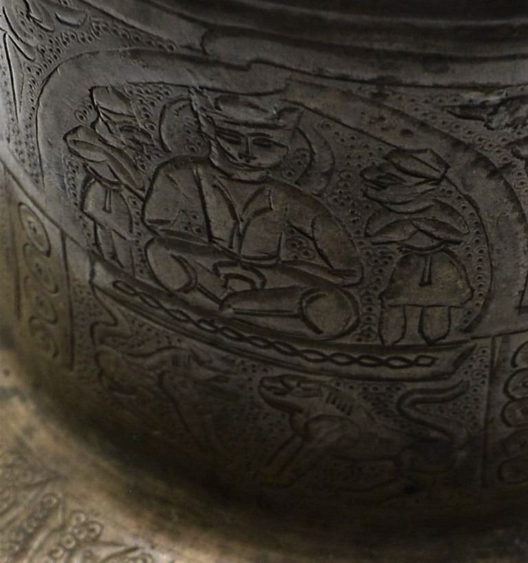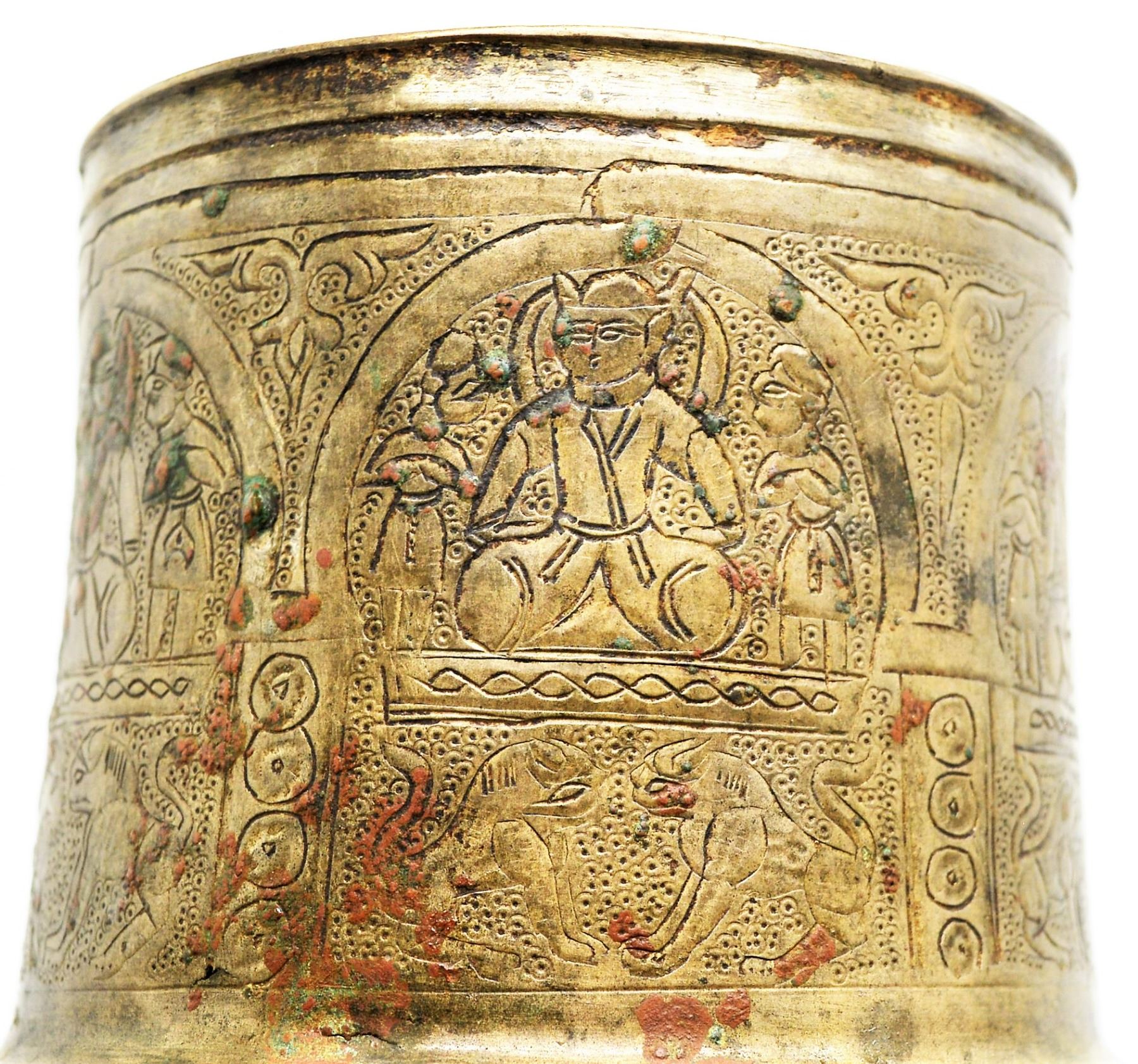 CENTURY. the interior incised with a central seated figure of a ruler flanked by armed warrior to either side, the sides with a bold frieze comprising three groups of warriors, each with a pair of lances, one of which bears a streamer, their shields variously with rosettes and circles, each of the groups of warriors separated by a mounted ruler with a halo, a pair of mounted warriors and a caparisoned horse, around the rim a band of floriated kufic inscription; the exterior with a central six-pointed star filled with palmettes, above a band of paired panels of kufic and the rim with a wide band of palmette vine