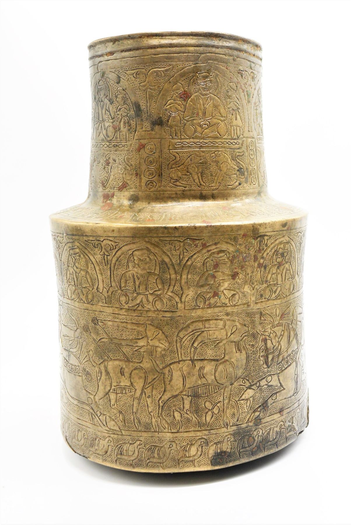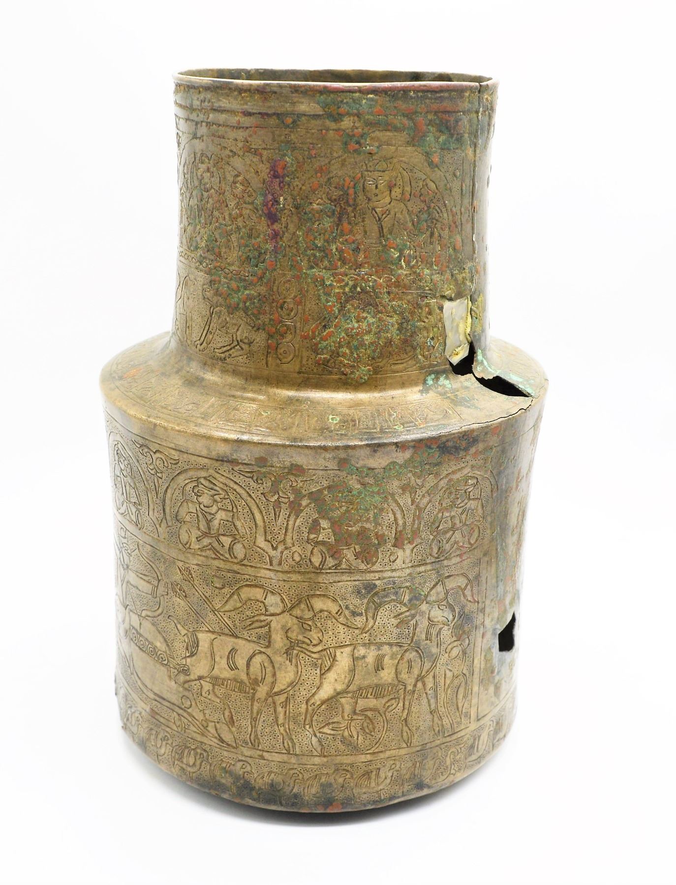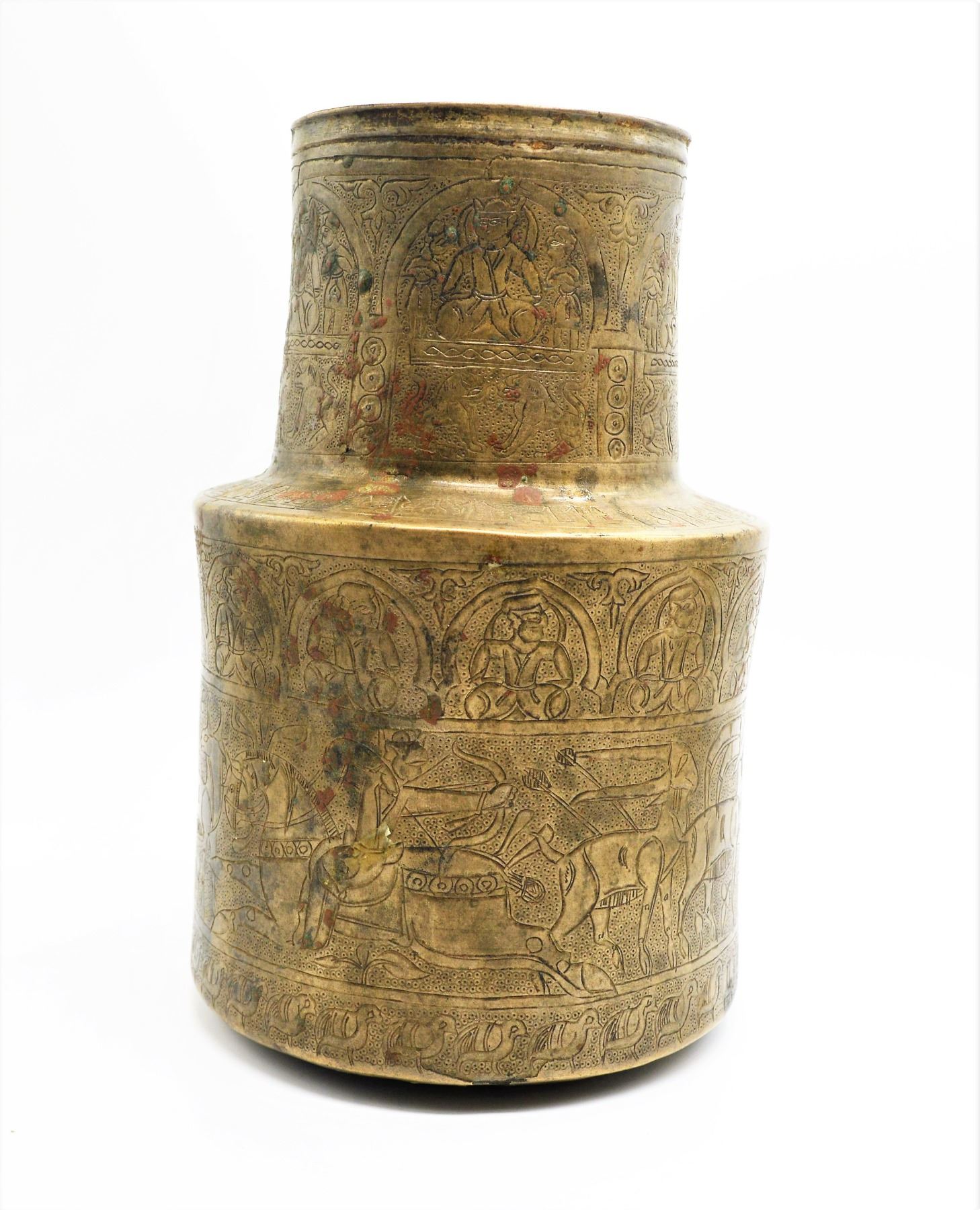 CENTURY. the interior incised with a central seated figure of a ruler flanked by armed warrior to either side, the sides with a bold frieze comprising three groups of warriors, each with a pair of lances, one of which bears a streamer, their shields variously with rosettes and circles, each of the groups of warriors separated by a mounted ruler with a halo, a pair of mounted warriors and a caparisoned horse, around the rim a band of floriated kufic inscription; the exterior with a central six-pointed star filled with palmettes, above a band of paired panels of kufic and the rim with a wide band of palmette vine