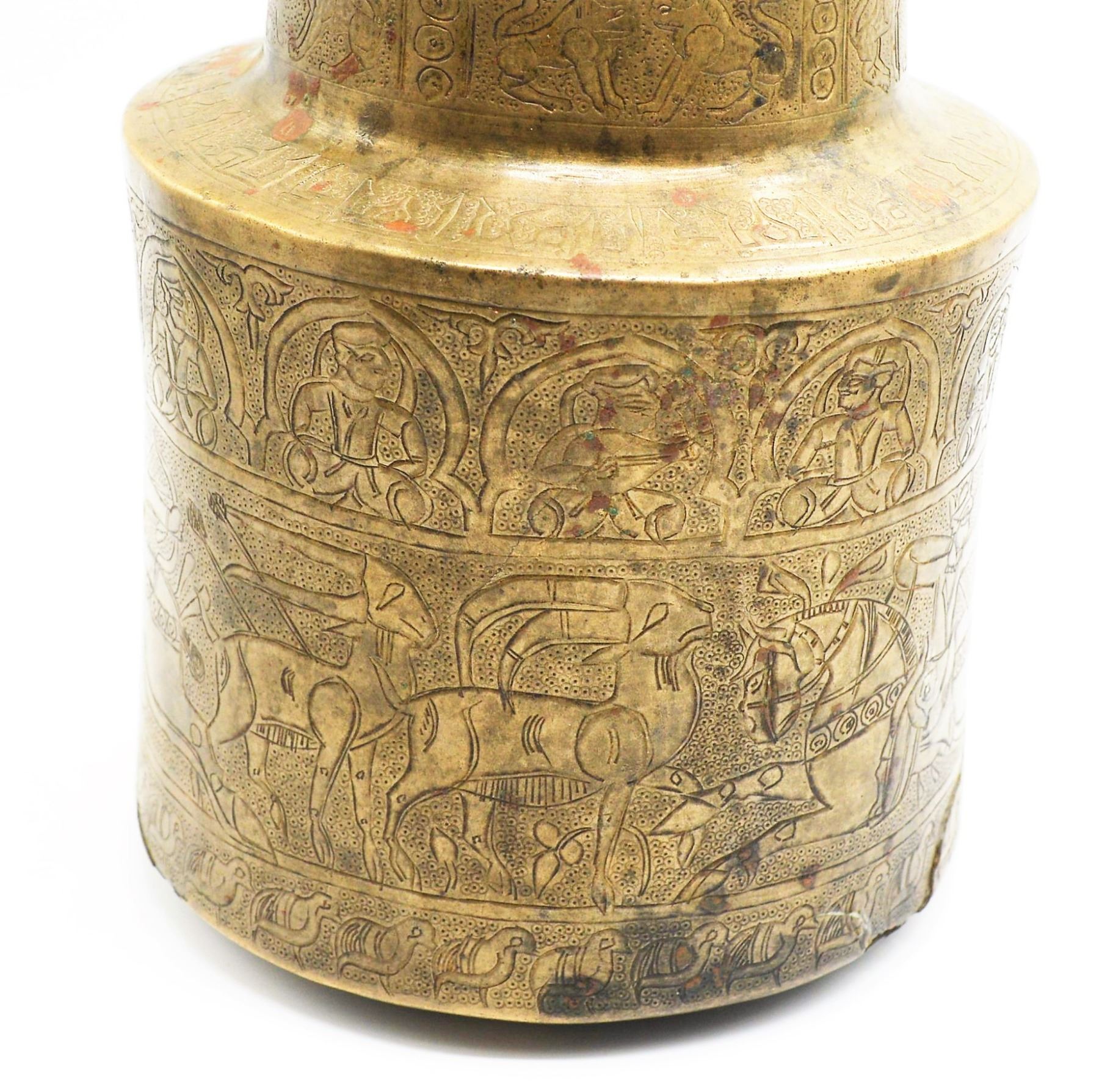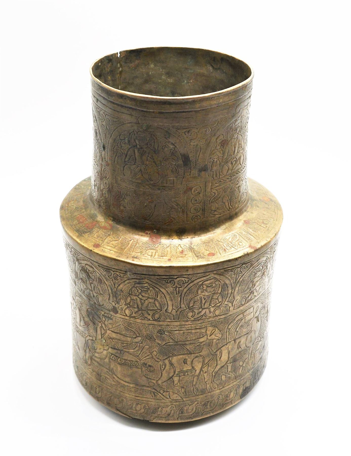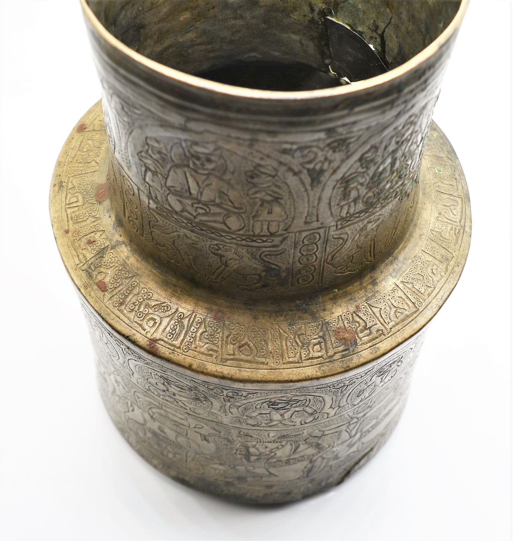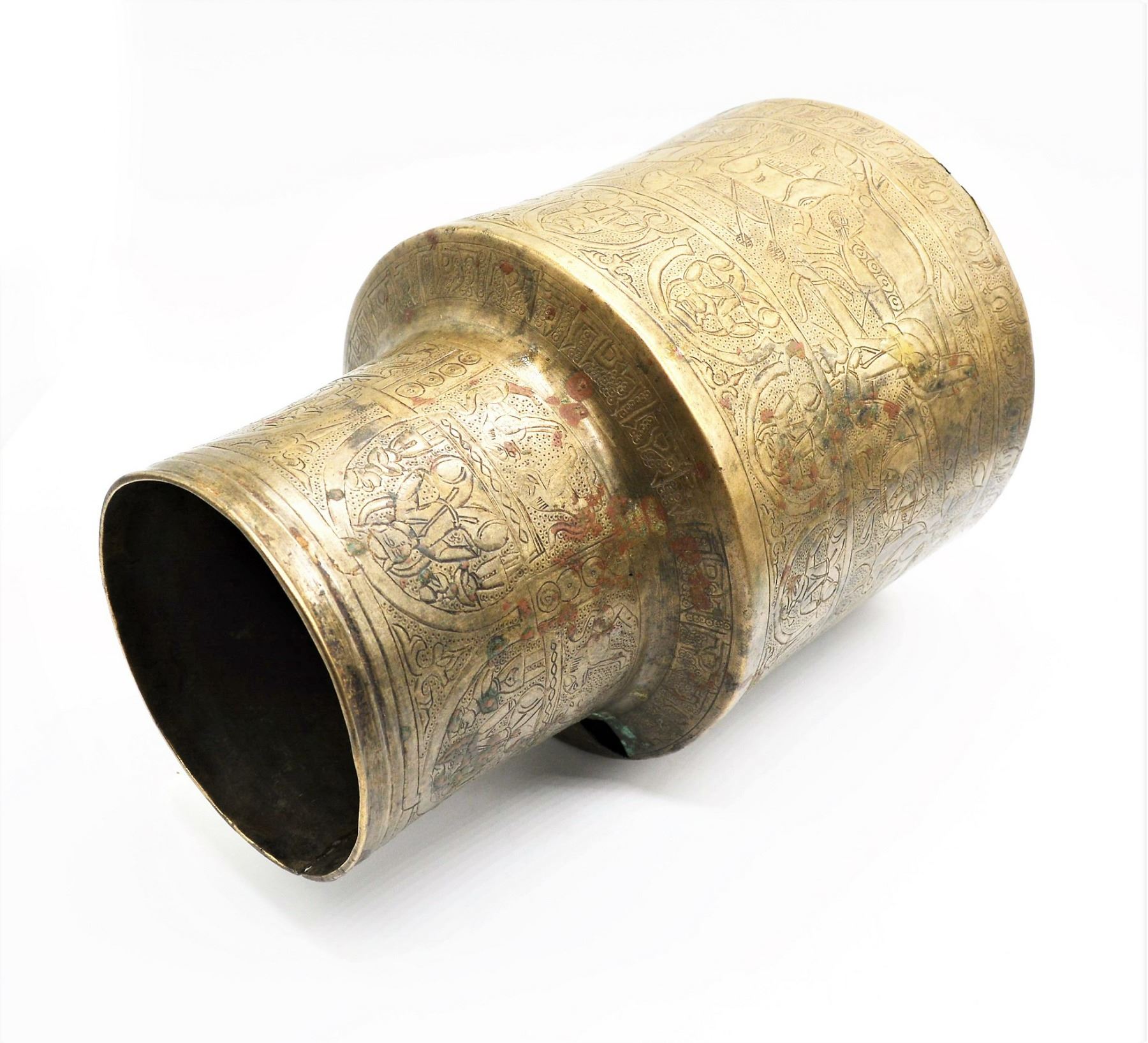 CENTURY. the interior incised with a central seated figure of a ruler flanked by armed warrior to either side, the sides with a bold frieze comprising three groups of warriors, each with a pair of lances, one of which bears a streamer, their shields variously with rosettes and circles, each of the groups of warriors separated by a mounted ruler with a halo, a pair of mounted warriors and a caparisoned horse, around the rim a band of floriated kufic inscription; the exterior with a central six-pointed star filled with palmettes, above a band of paired panels of kufic and the rim with a wide band of palmette vine
