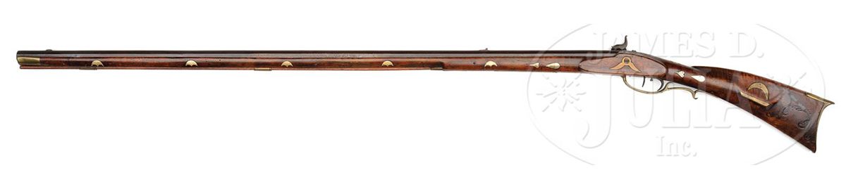NSN. 42-3/8" full oct .36 Cal rifled unmarked bbl. 4-pc brass patchbox with 7 piercings. Maple stock is incised carved to the rear of cheekpiece. Rifle has 19 silver inlays, 4-1/2" brass saddle plate, 5-1/5" brass comb inlay and a brass half moon cheek inlay. Rifle has double set triggers. PROVENANCE: Frank Sujansky Collection. CONDITION: 9" crack on left side of forend running forward of rear entrance pipe, and 4-1/2" crack running back from rear sight. Percussion lock is not working and needs adjustment. 4-49442 RG16