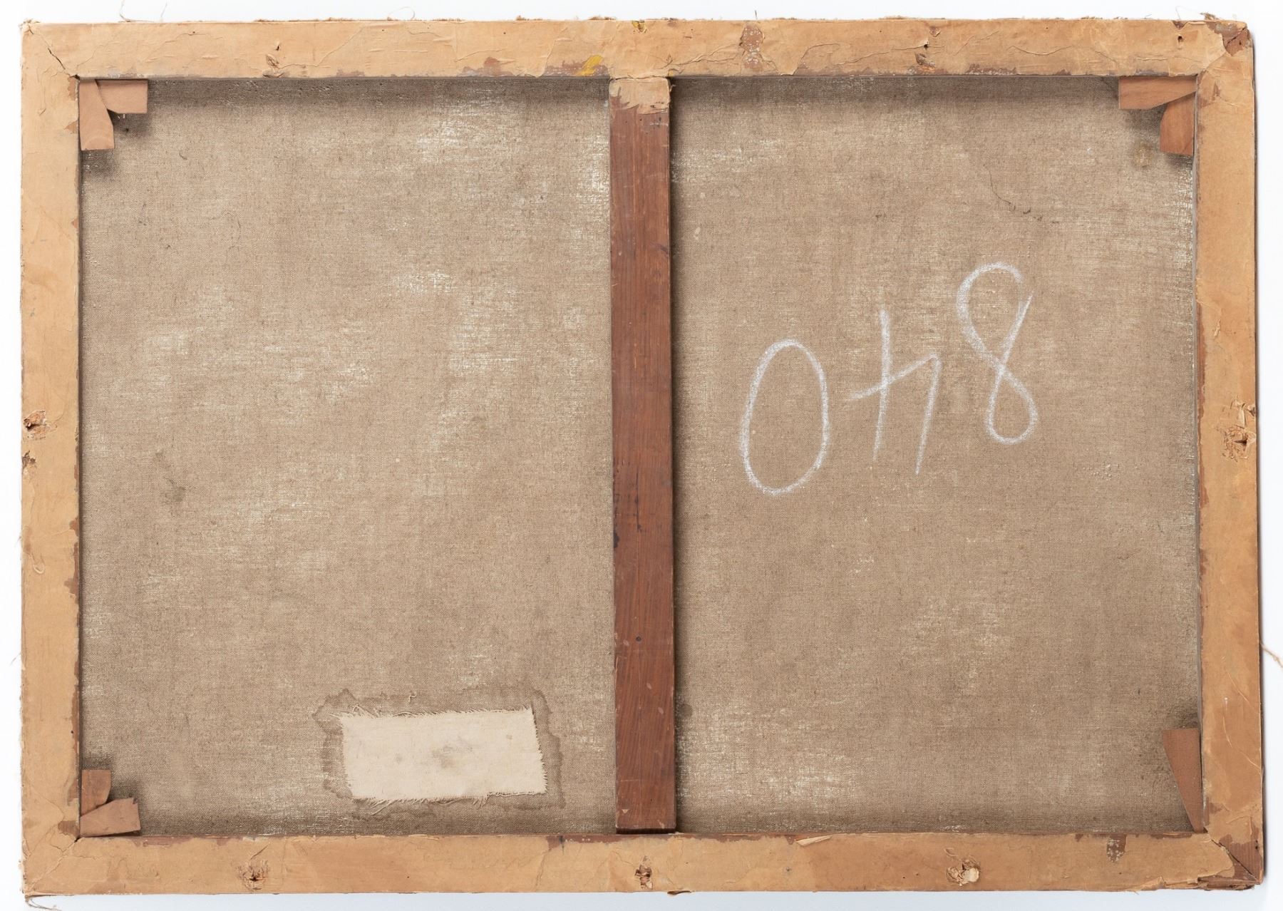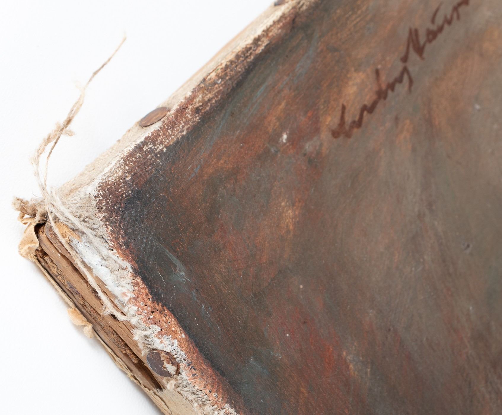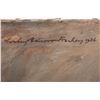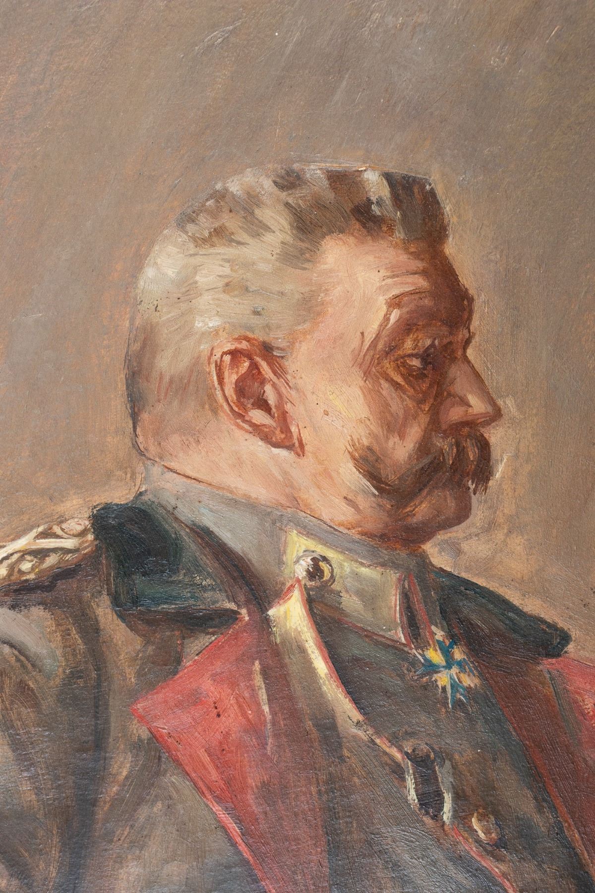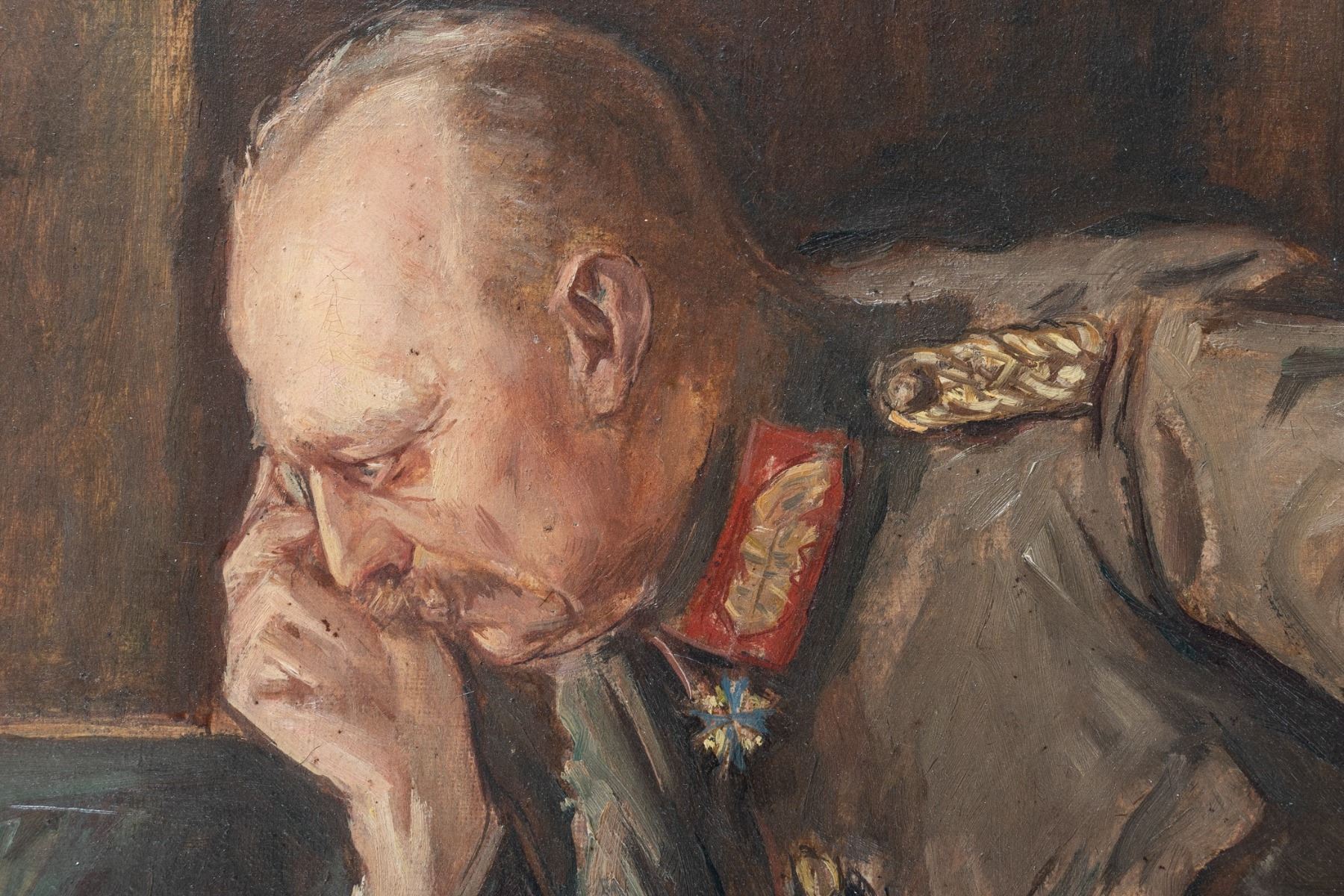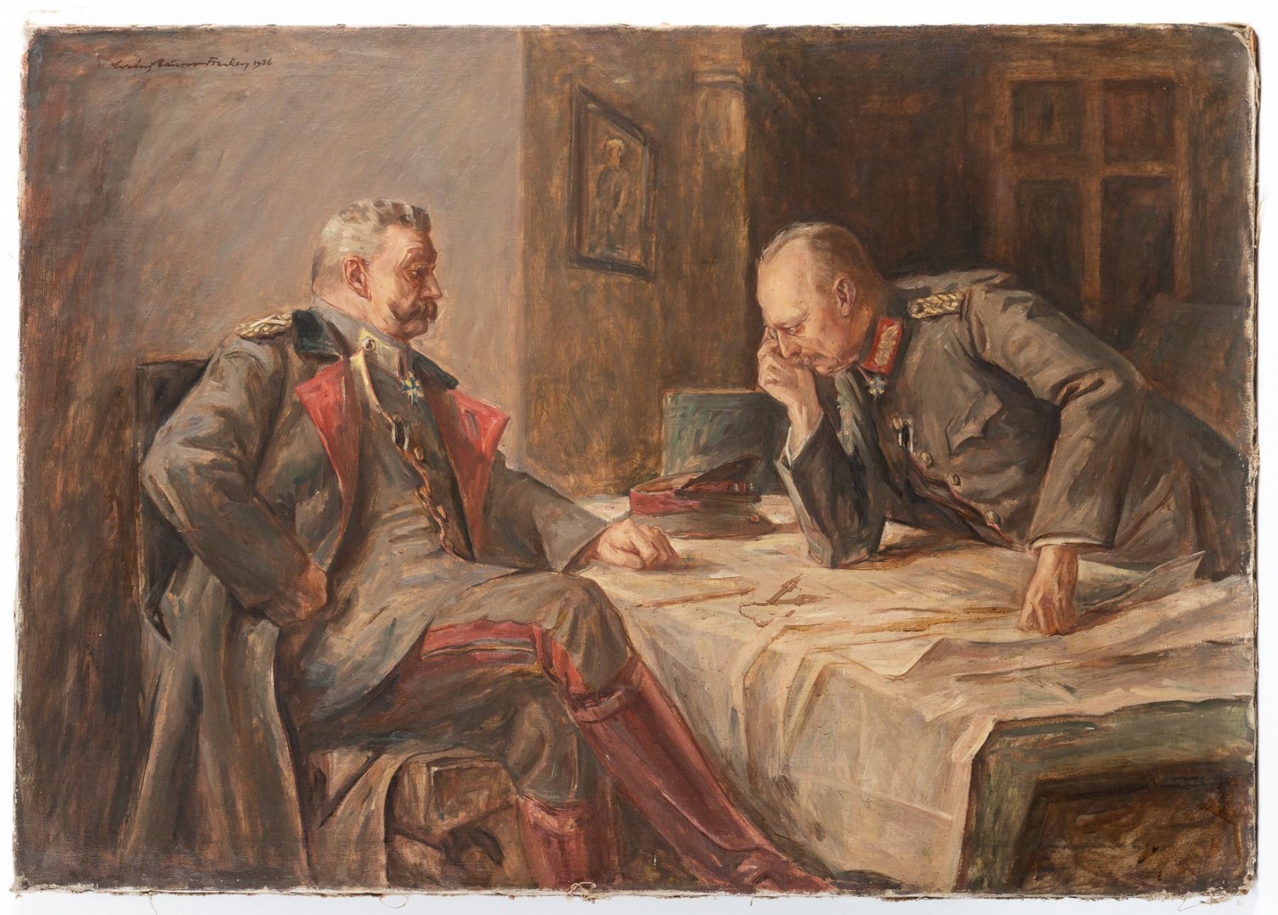Large painting of Paul von Hindenburg and Erich Ludendorff looking over maps and plans for WWI. Signature of the artist on the canvas is illegible, possibly 'Frauley', and is dated, '1936'. Original artwork was done by Hugo Vogel, this is a copy of his work. Stretched canvas nailed to wooden frame. 27.5 x 39.25 inches.