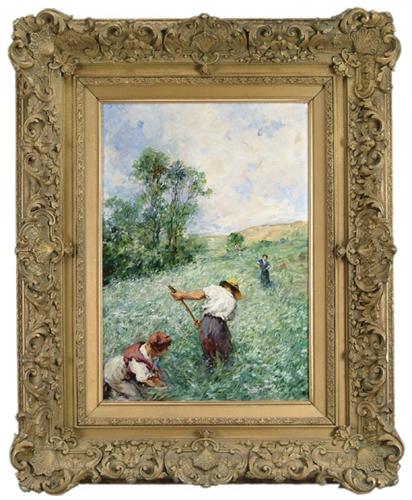 HIPPOLYTE GIRARD (French, 19th Century) TENDING THE FIELD OF FLOWERS. Colorful scene shows a man and two women tending to a large field of flowers with white and blue blooms. A summer landscape with hillside and trees under a blue and cloud sky. Signed lower right. Housed in a magnificent gesso decorated wide and fancy frame. SIZE: 20in. x 14in.. CONDITION: Very good, minor touch up in sky. 9-26466