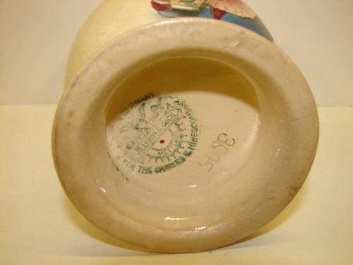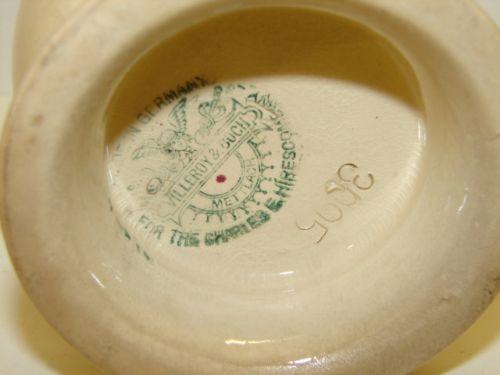 HIRES ROOTBEER MUG. Marked with text “Drink Hires Rootbeer” and decorated with child drinking rootbeer from mug. Marked on bottom “Villeroy & Boch/Mettlach” and stamped “3095”. Shows signs of crazing. 4.25” H