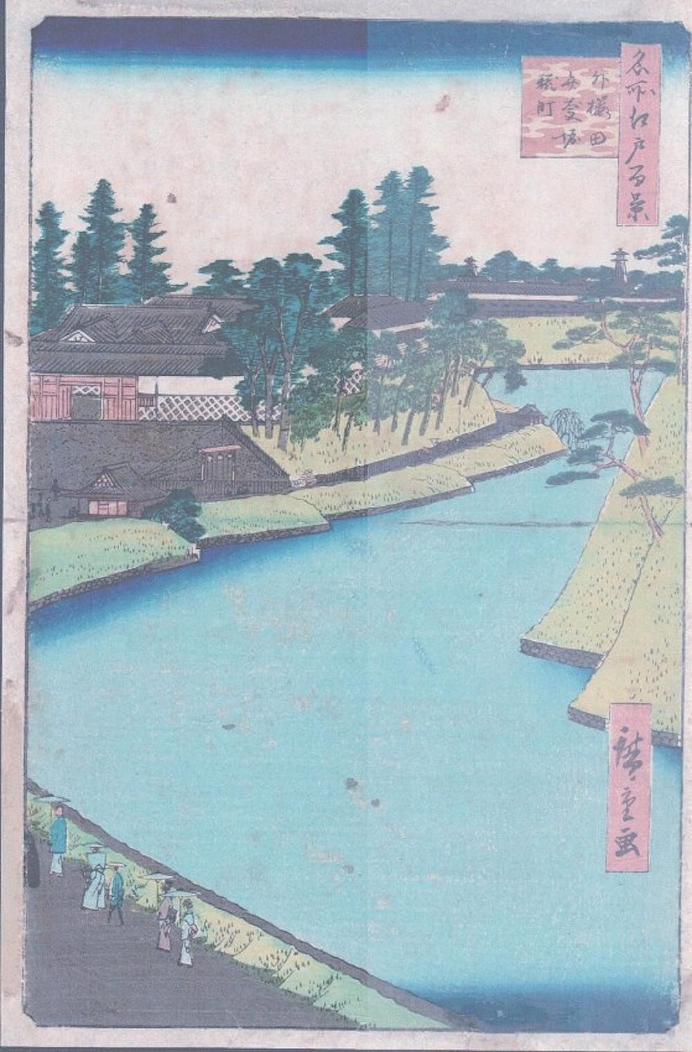 HIROSHIGE: 100 FAMOUS VIEWS OF EDO. BIRDS EYE VIEW OF A CANAL. OBAN, TATE-E. MEASURES AT 14 X 9 1/4. CIRCA 1857. GOOD COLOR AND IMPRESSION. MARGINS SLIGHTLY TRIMMED, AND SOILED, some STAINE on the margin and few inside baced with paper