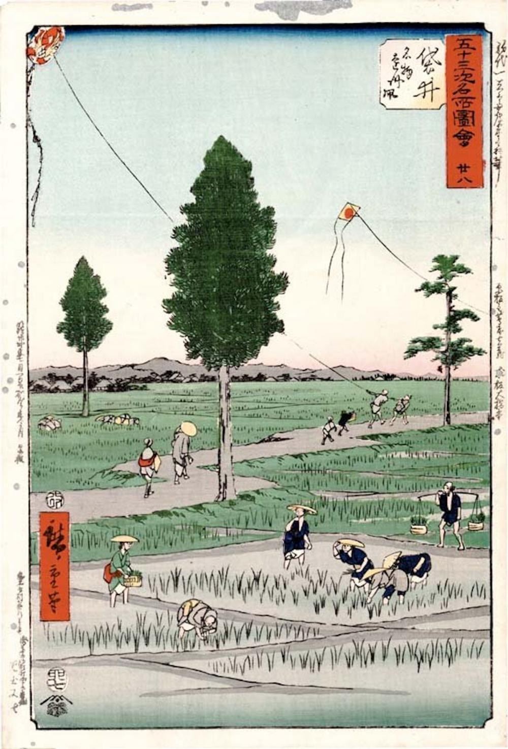HIROSHIGE \"53 STATIONS OF THE TOKAIDO\" (UPRIGHT TOKAIDO), SEAL:1858 :?, 14 2/8 X 9 7/8 IS BACKED FULL SHEET COVERING WORMHOLES AROUND THE MARGINES