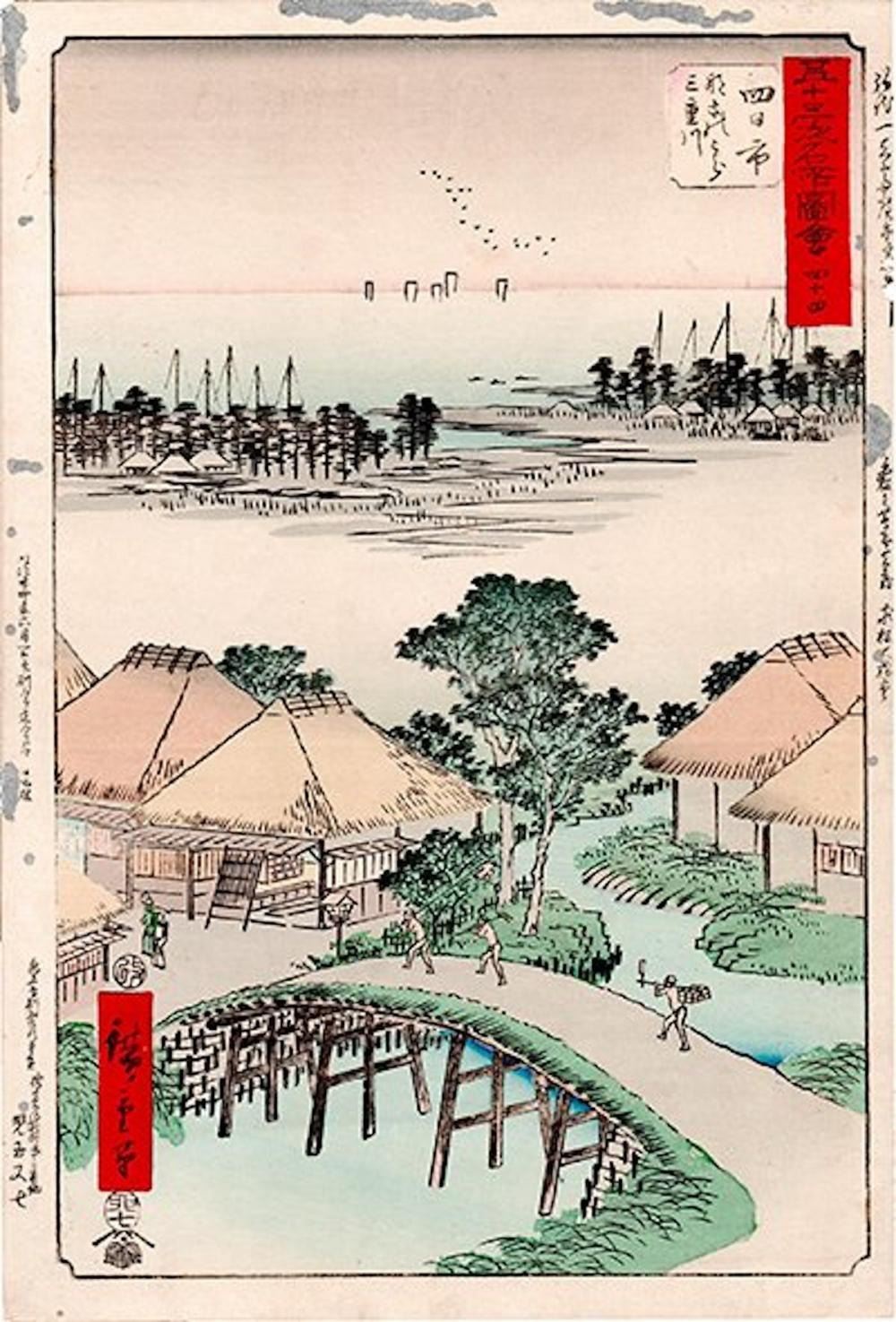 HIROSHIGE "53 STATIONS OF THE TOKAIDO" (UPRIGHT TOKAIDO), SEAL:1858?. , 14 2/8 X 9 7/8. BACKED, FULL SHEET COVERING WORMHOLES AROUND THE MARGINS