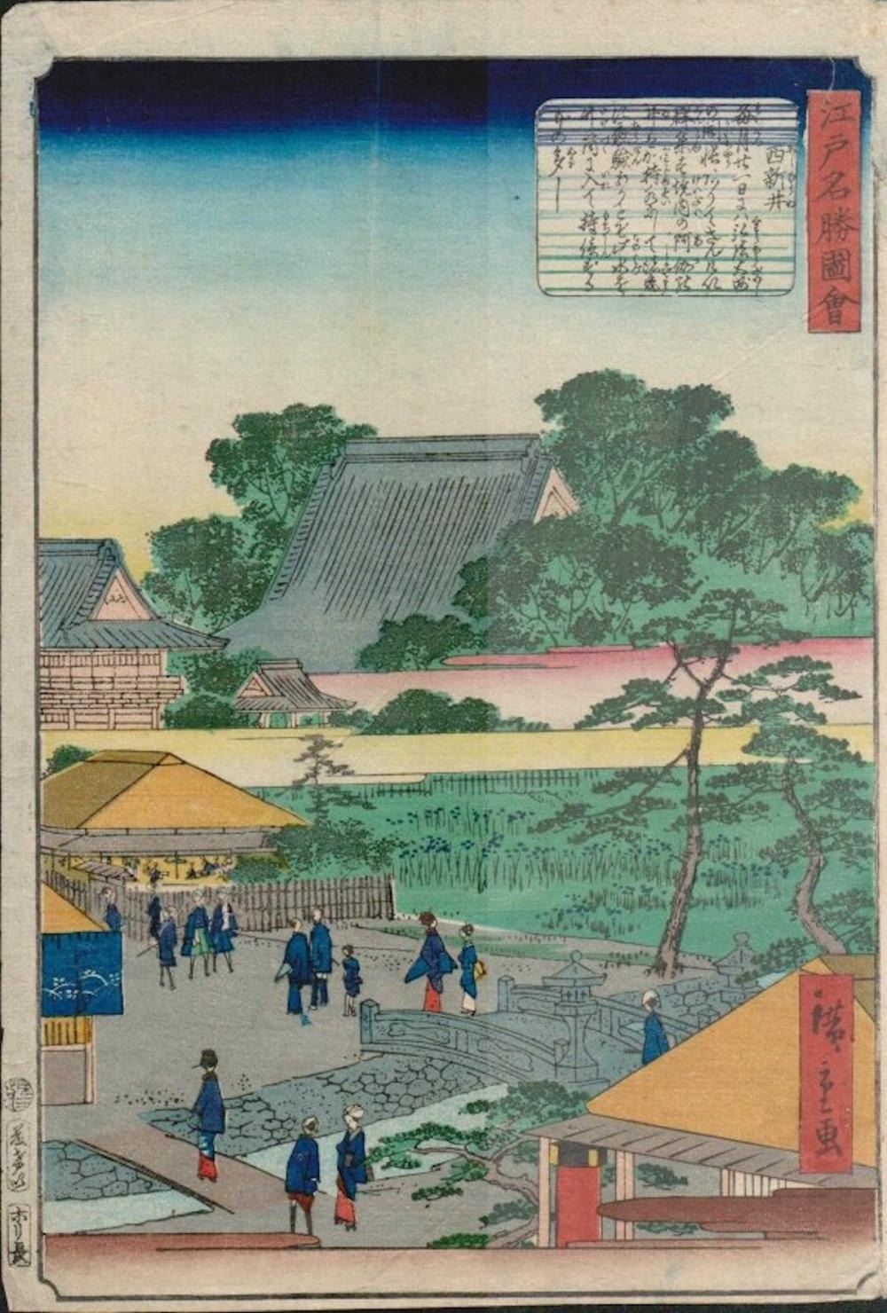 HIROSHIGE II: VILLAGE SCENE. OBAN, TATE-E, MEASURES AT 14 1/8 X 9 3/4. CIRCA 1860. VERY GOOD COLOR AND IMPRESSION. TWO TIGHT CREASES. THINNED SPOT AT UPPER RIGHT MARGIN.