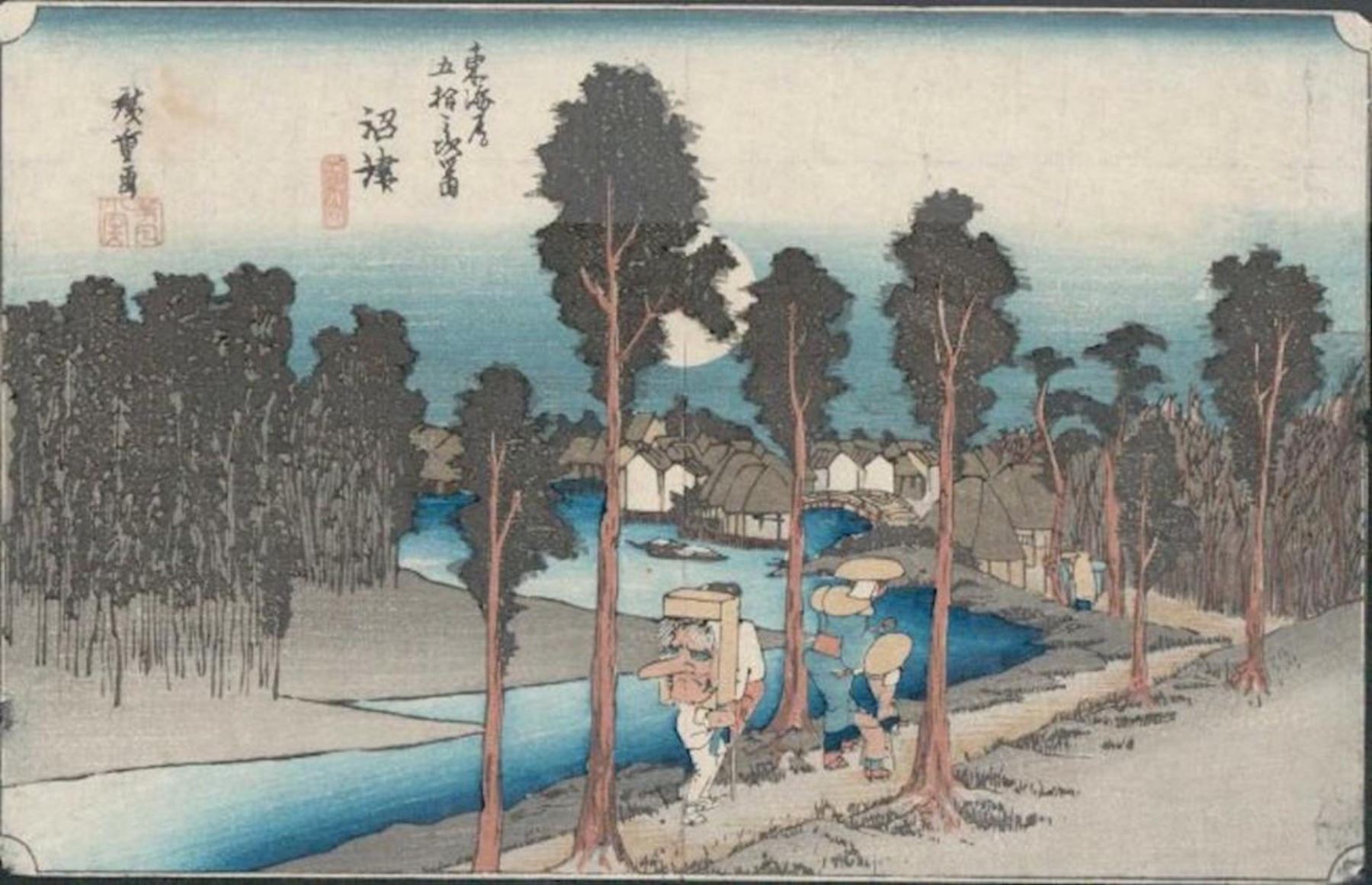 HIROSHIGE SERIES: 53 STATIONS OF THE TOKAIDO- HOEIDO TOKAIDO EDITION. TRAVELERS ALONG A PATH. OBAN, YOKO-E. MEASURES AT 8 5/8 X 13 9/16. GOOD COLOR IMPRESSION AND CONDITION. MARGINS TRIMMED.