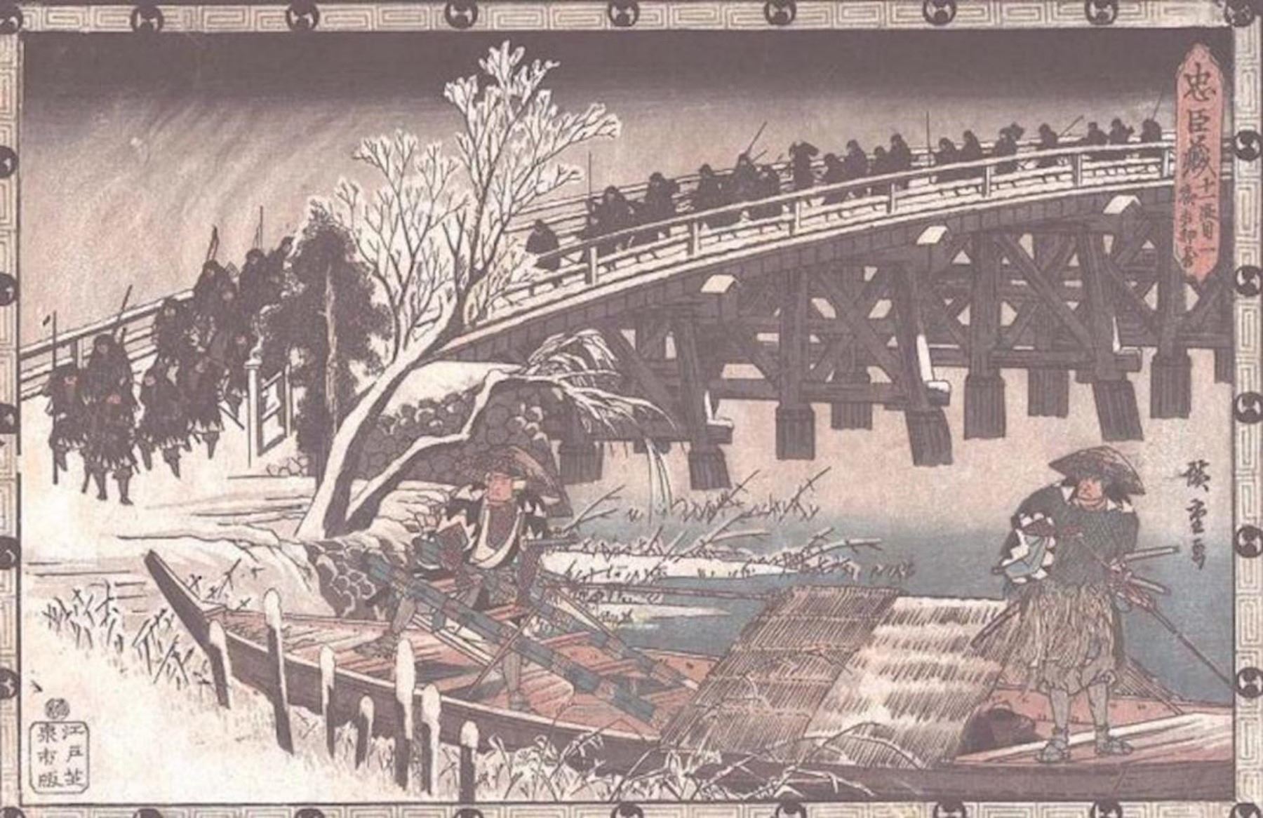 HIROSHIGE SERIES: CHUSHINGURA ACT 10. OBAN, YOKO-E. CIRCA 1840. MEASURES AT 9 X 14. VERY GOOD COLOR, IMPRESSION AND CONDITION. MARGINS ARE VERY SLIGHTLY TRIMMED. COMMENT: THE BEST AND MOST FAMOUS DESIGN OF ANY HIROSHIGE'S CHUSHINGURA DESIGNS.