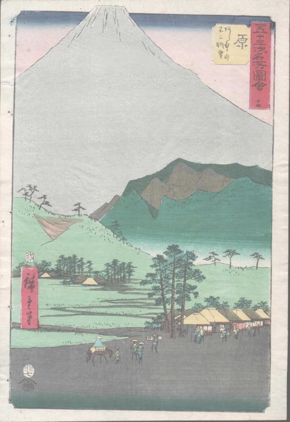 HIROSHIGE SERIES: UPRIGHT TOKAIDO. OBAN TATE-E. MEASURES AT 14 1/4 X 9 3/4. CIRCA 1840. VERY GOOD COLOR, IMPRESSION AND CONDITION. BINDING HOLES