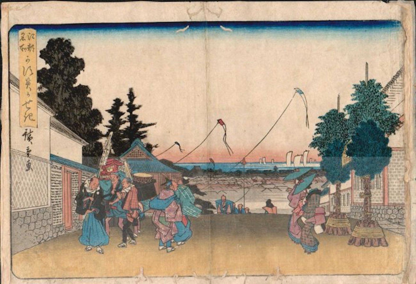 HIROSHIGE - "TOTO MEISHO VIEW OF EDO FROM TOP OF A HILL", CIRCA 1840, TRIMMED ON RIGHT, WROMAGE AT TOP AND BOTTOM. CENTER FOLD, BACKED, MEASURES AT 9 1/2 X 14 1/8
