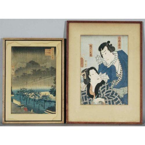 1 HIROSHIGE/TOYOKUNI Rain over Bridge and Samori and Geisha each about 13"x8" sight CONDITION REPORT: stains and toning. PACKING AND SHIPPING (excluding insurance) by Fairfield Auction to points within the Continental U.S.A. and Canada (all other international must be handled by 3rd party shipper) $40.