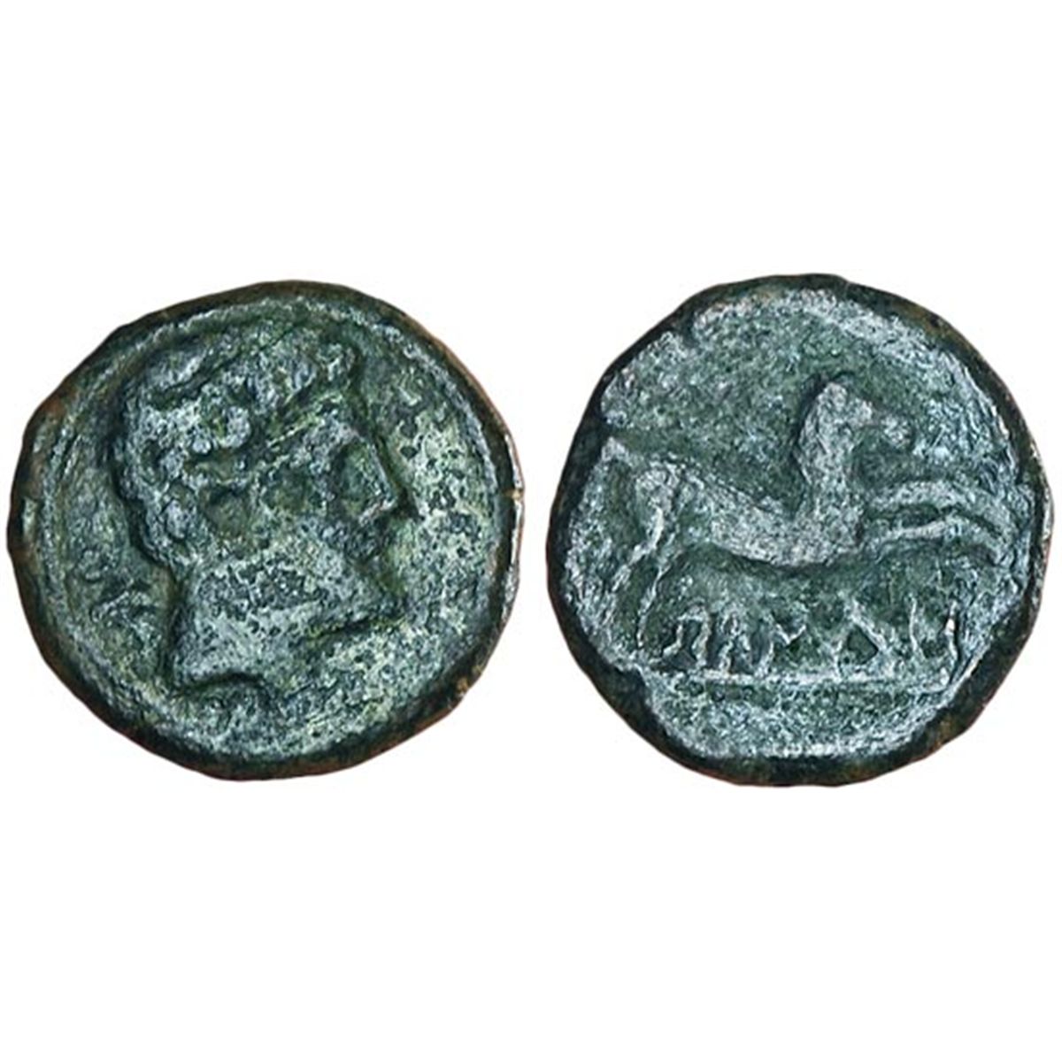 Beligiom. Cuadrante. 120-20 a.C. Belchite (Zaragoza). Anv.: Cabeza con barba a derecha y detrás letra ibérica. Rev.: Caballo saltando a derecha, encima cuatro puntos y debajo leyenda ibérica. ABH-248. Ae. 4,03gr. MBC-.