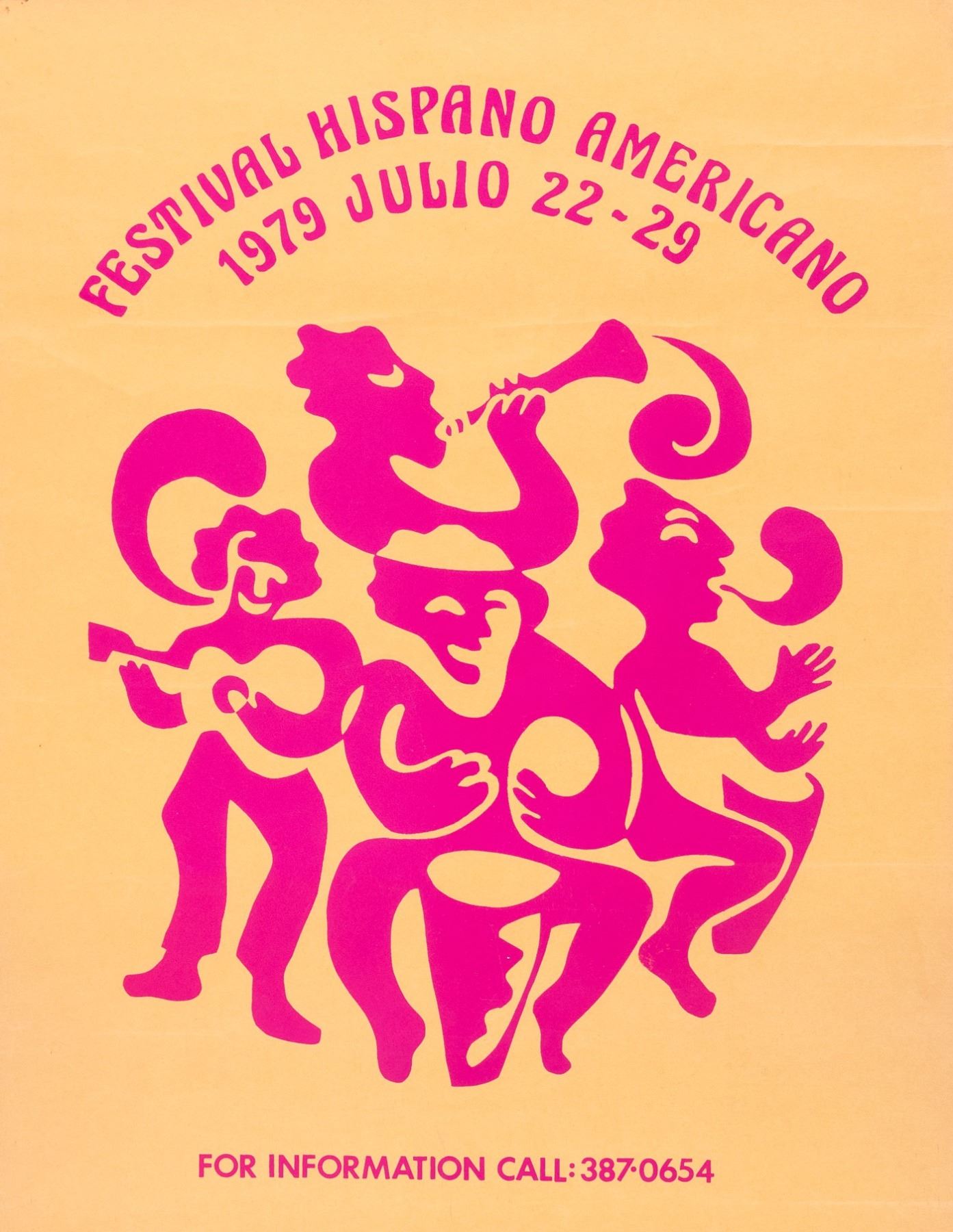 Vintage poster for the 'Festival Hispano Americano 1979 Julio 22 - 29', a bright illustration of several band members playing instruments. 17.5 x 23 inches. Mailing folds, minor damage on edges, and minor creases.