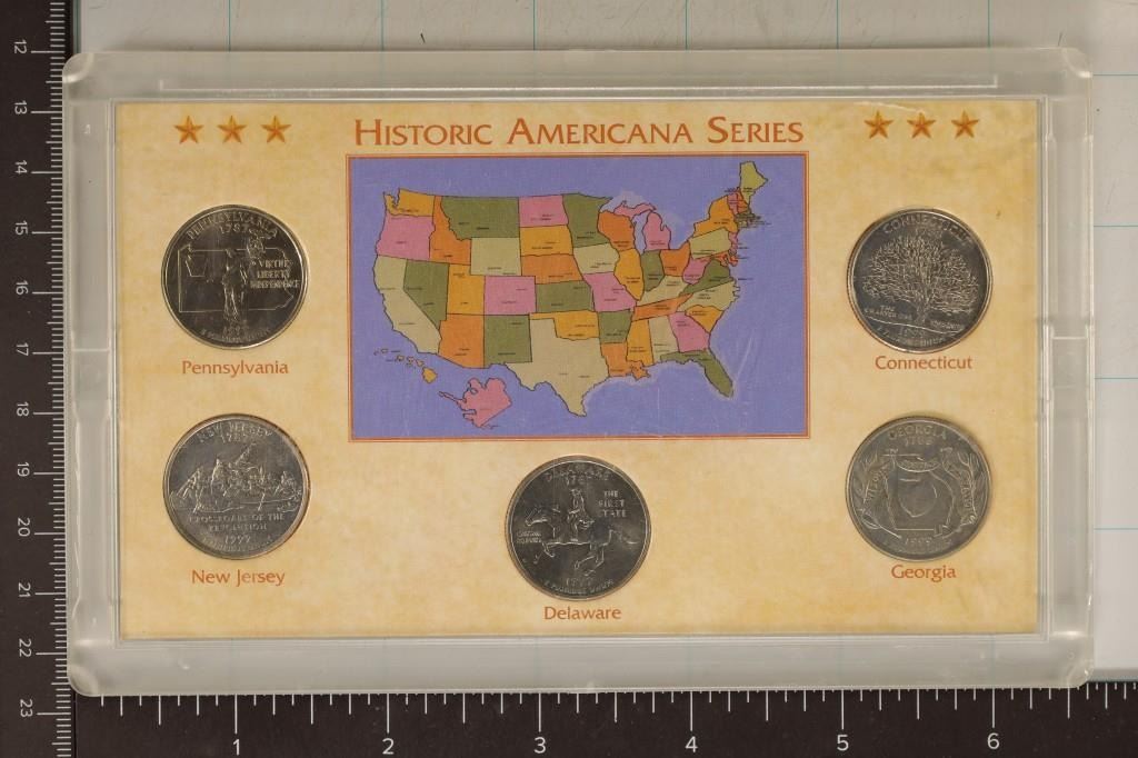 QUARTERS IN HARD PLASTIC CASE. CONNECTICUT, DELAWARE, GEORGIA, PENNSYLVANIA AND NEW JERSEY. ALL ARE UNC
