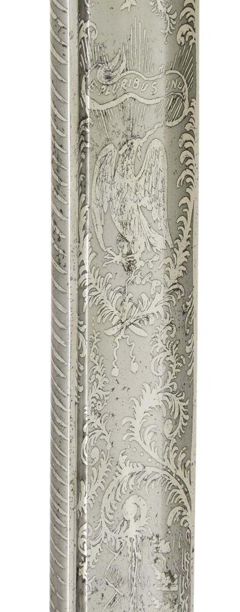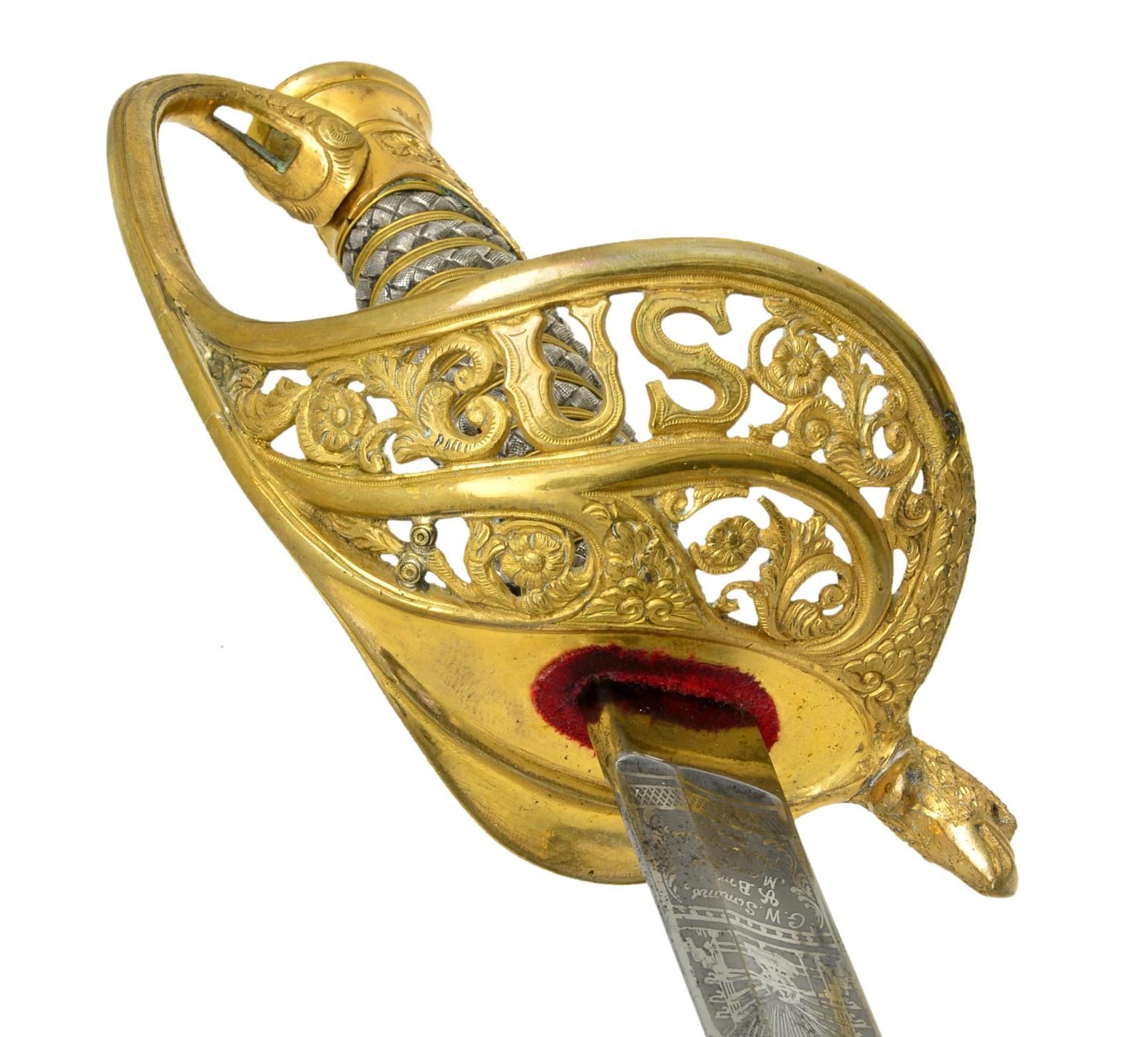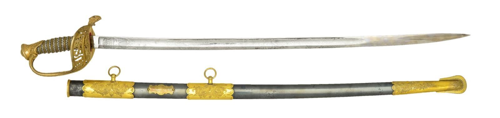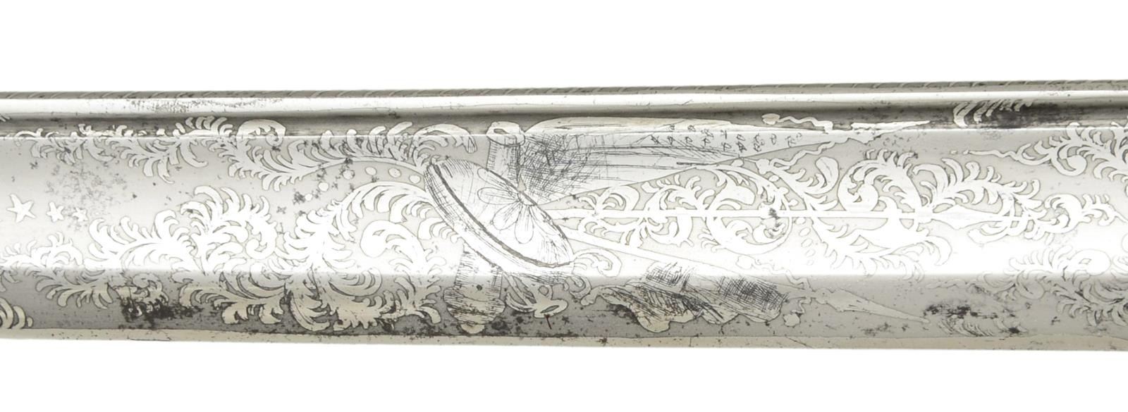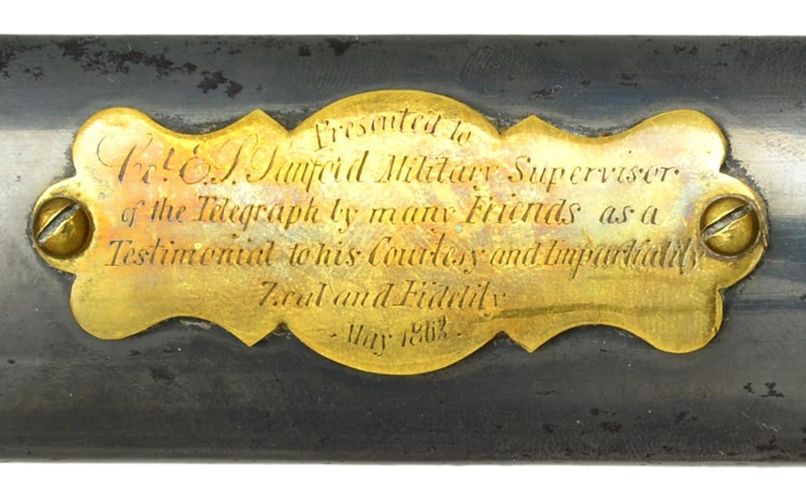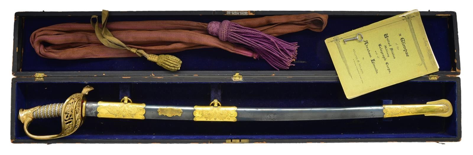 SWORD TO COL. EDWARD SANFORD, MILITARY SUPERVISOR OF THE TELEGRAPH. The telegraph was the most important innovation for military communications of the Civil War & used to great affect by Abraham Lincoln, & his secondary of war, who communicated w/ his generals via telegraph. The phenomenal custom detailed etching on this blade shows in 8" panel the telegraph lines leading from the capital south down the Telegraph Road to military headquarters in Virginia, under the lines on the telegraph poles is a poem: “With lightning strides / Which thought alone can trace / Annihilates in turn / Both time, and space”. Etched battle scenes are rare on sword blades, but this unique etch is incredible. The other side of blade 5" panel: “E.S. SANFORD” w/ a lightning bolt like terminations representing the electricity of Sanford’s telegraph lines. Each side of blade has 22" etched patriotic panels including mottoes “OUR GLORIOUS UNION FOREVER” & “LIBERTY OR DEATH”. Sword is high grade model 1850 staff & field officer’s sword w/ eagle head quillon w/ red ruby eyes, basket weave spiral silver grip w/ triple gilded wire wrap. Hilt, pommel, & scalloped scabbard mounts are richly chased & engraved in foliate design. Blade of drag is decorated. Scabbard body is fire blued steel. Etched on ricasso: “W.G. Simmons & Bros / Manufacturers / Philadelphia, Penn”. A small presentation plaque is found between the top mounts: presented to /Col. E.S. Sanford Military Supervisor / of the Telegraph by Many friends as a / Testimonial to his Courtesy and Impartiality / Zeal and Fidelity / May 1862”. There was no US government telegraph organization before the Civil War, there was no appropriation of funds by Congress to pay for the expenses of erecting poles, running cables, or the salaries of operators. The huge cash outlay establishing the U.S. Military Telegraph Corps was paid by Sanford, who was doing his patriotic duty as he had the wealth & resources & knew he would eventually be repaid by the government which he was. By the time of the presentation of the sword, the US Military Telegraph Corps was a well established juggernaut sending & receiving over 3000 encrypted military telegraphs every day. Lincoln was very much aware of the value of the telegraph & would nearly take personal command of battle fronts through its use. Lincoln would be at the military telegraph office by the capital w/ the Secretary of War every day. All orders the telegraph operators received came directly from the Secretary of War by direction of the president. The value of the Military Telegraph was recognized by Secretary of War Stanton in his official report to Congress Dec., 1863: "The Military Telegraph, under the general direction of Col. Stager and Major Eckert, has been of inestimable value to the service, and no corps has surpassed, few have equaled, the telegraph operators in diligence & devotion to their duties. At the fall of Richmond, April 3, 1865, after announcing the fact, from the office window of the War Department, to the assembled multitude beneath, Secretary of War Stanton turned to the operators in the room & said: "Boys, I consider the telegraph my right arm, & if ever I can do anything for you, don't hesitate to ask it". Edward Sewell Sanford (1817-1882) Civil War Union Brevet Brigadier General, Businessman. The President of the American Telegraph Company at the start of the Civil War, his expertise in telegraph communications was called upon by the Union to help defeat the rebellion. Commissioned Colonel, US Volunteers, he served as Military Supervisor of Telegraphic Messages for the Union Army. He was brevetted Brigadier General, US Volunteers on March 13, 1865 for "meritorious services". By the war’s end over 6 million military telegrams had been sent & received. Col. Sanford’s establishing of U.S. Military Telegraph Corps communication changed the way war was fought. Lincoln felt he always had up to date news because of his constant telegraphic updates even during battles being fought. Over 1200 men age 16 to 22 manned over 15,000 miles of telegraph wires of the U.S. Army’s Military Telegraph Corps, over 300 died or killed during the war, much higher rate of death than soldiers. This is the most impressive & unique blade etch design I have ever encountered, the artist who rendered these unique images & verse must have understood the impact & importance of electric communication! UNATTACHED ACCESSORIES: William Wilson 1889, 20 page “A Glimpse of the United States Military Telegraph Corps and of Abraham Lincoln” and Tom Weaver “Lincolns T-Mails”. CONDITION: extremely fine overall, blade retains virtually all its luster and shine w/ some light black staining. Original red cloth protective washer is retained. Silver spiral grip & triple wire wrap are fine & complete. Hilt, pommel, & scabbard mounts retain much of their original gold wash. Scabbard body retains over 90% of its bright blue finish w/ staining & pinprick pitting near throat. Gilt bullion sword knot is complete & fine. Red silk sash is fair, missing one of its knotted tassels. 41x6x3" Custom fabric veneered blue velvet lined wood casing is fine internally, scuffed & worn edges, functional lock w/ original key. (02-14857/JS). $25,000-50,000.