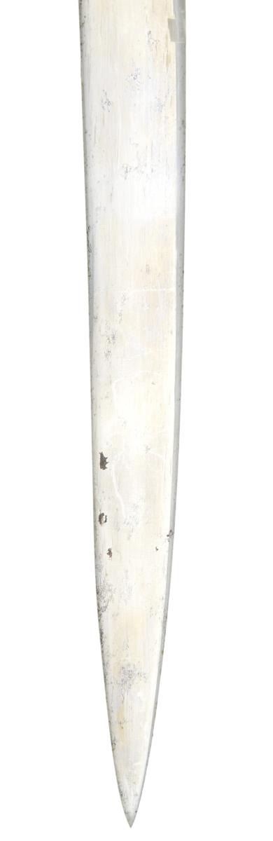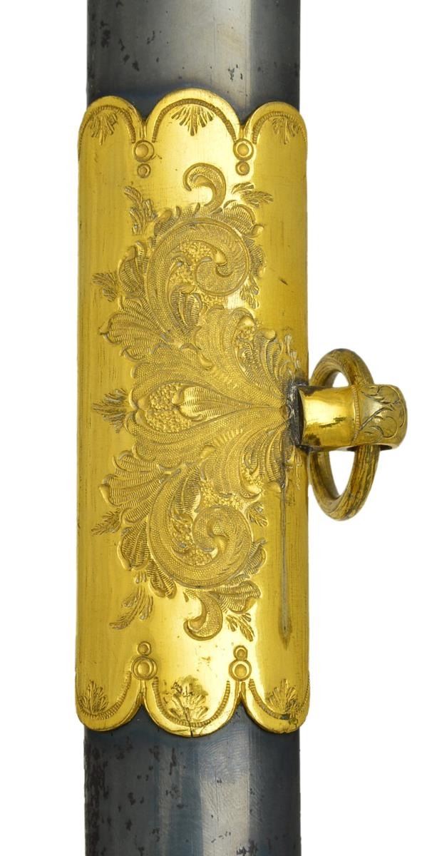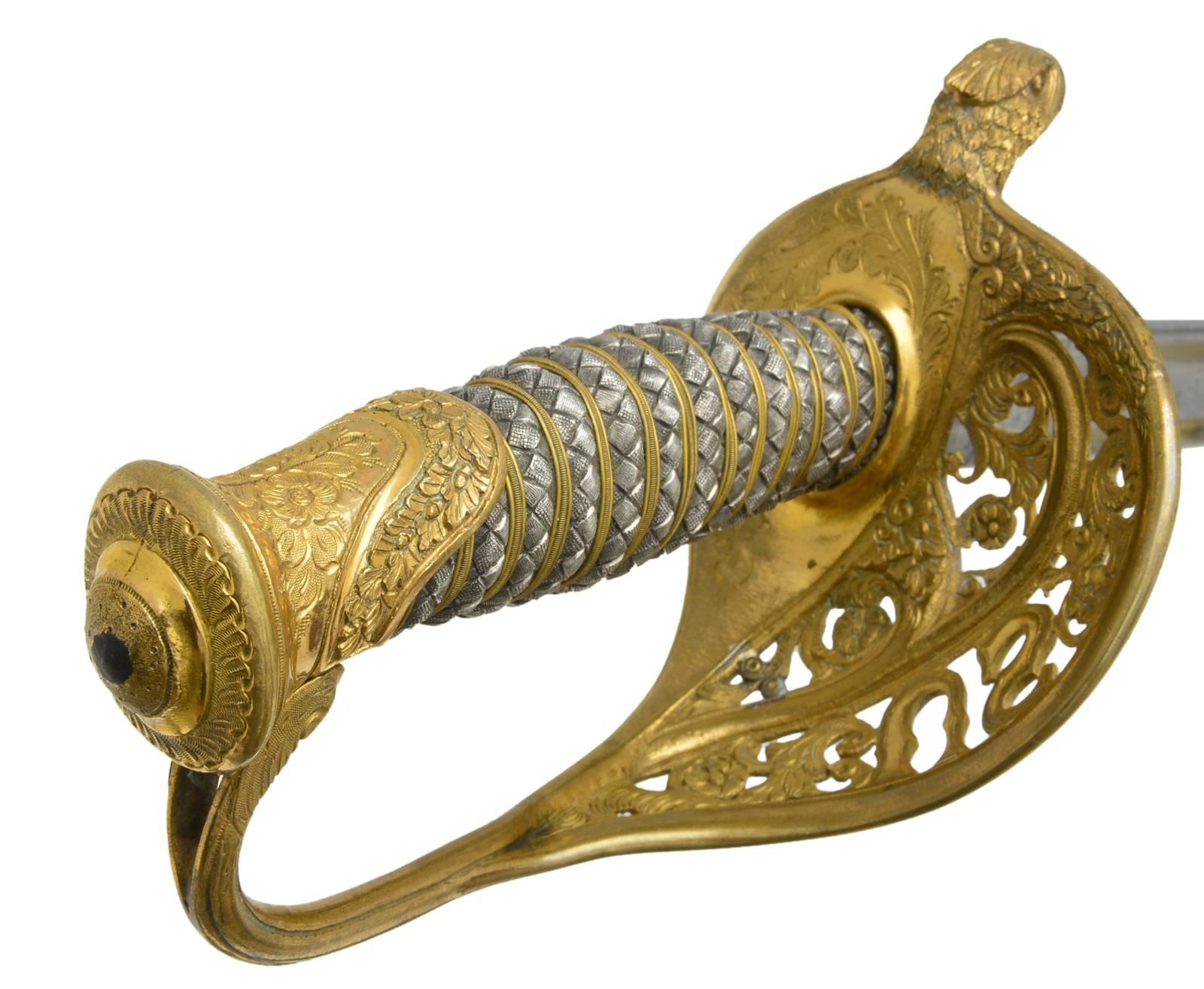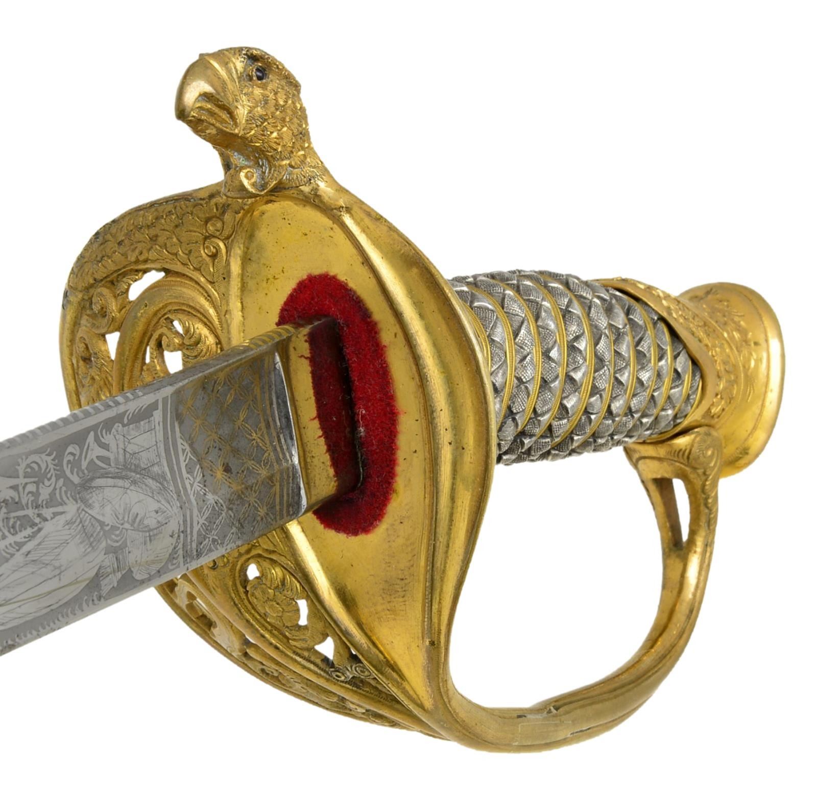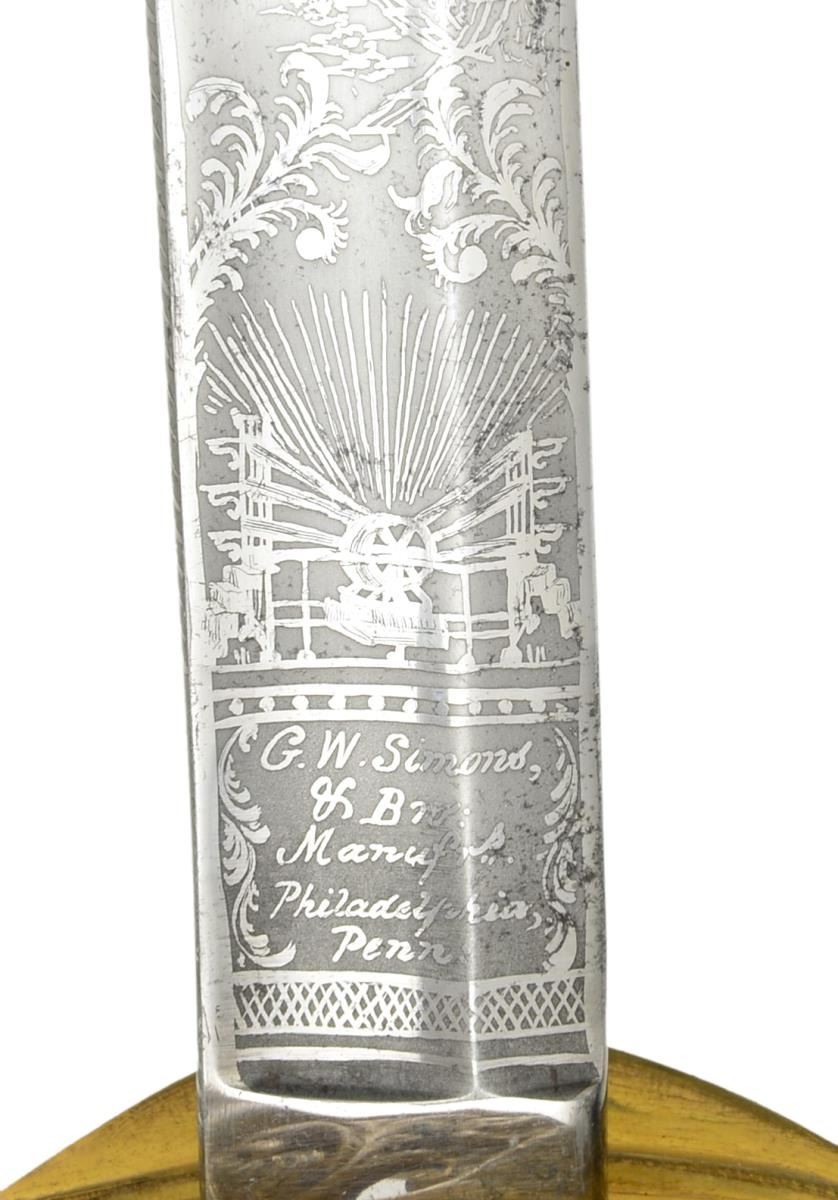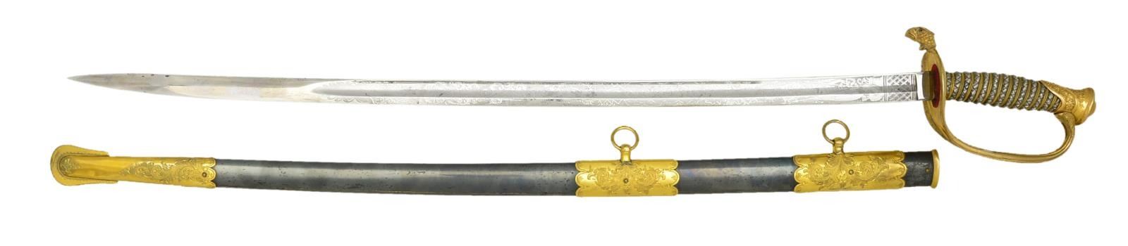 SWORD TO COL. EDWARD SANFORD, MILITARY SUPERVISOR OF THE TELEGRAPH. The telegraph was the most important innovation for military communications of the Civil War & used to great affect by Abraham Lincoln, & his secondary of war, who communicated w/ his generals via telegraph. The phenomenal custom detailed etching on this blade shows in 8" panel the telegraph lines leading from the capital south down the Telegraph Road to military headquarters in Virginia, under the lines on the telegraph poles is a poem: “With lightning strides / Which thought alone can trace / Annihilates in turn / Both time, and space”. Etched battle scenes are rare on sword blades, but this unique etch is incredible. The other side of blade 5" panel: “E.S. SANFORD” w/ a lightning bolt like terminations representing the electricity of Sanford’s telegraph lines. Each side of blade has 22" etched patriotic panels including mottoes “OUR GLORIOUS UNION FOREVER” & “LIBERTY OR DEATH”. Sword is high grade model 1850 staff & field officer’s sword w/ eagle head quillon w/ red ruby eyes, basket weave spiral silver grip w/ triple gilded wire wrap. Hilt, pommel, & scalloped scabbard mounts are richly chased & engraved in foliate design. Blade of drag is decorated. Scabbard body is fire blued steel. Etched on ricasso: “W.G. Simmons & Bros / Manufacturers / Philadelphia, Penn”. A small presentation plaque is found between the top mounts: presented to /Col. E.S. Sanford Military Supervisor / of the Telegraph by Many friends as a / Testimonial to his Courtesy and Impartiality / Zeal and Fidelity / May 1862”. There was no US government telegraph organization before the Civil War, there was no appropriation of funds by Congress to pay for the expenses of erecting poles, running cables, or the salaries of operators. The huge cash outlay establishing the U.S. Military Telegraph Corps was paid by Sanford, who was doing his patriotic duty as he had the wealth & resources & knew he would eventually be repaid by the government which he was. By the time of the presentation of the sword, the US Military Telegraph Corps was a well established juggernaut sending & receiving over 3000 encrypted military telegraphs every day. Lincoln was very much aware of the value of the telegraph & would nearly take personal command of battle fronts through its use. Lincoln would be at the military telegraph office by the capital w/ the Secretary of War every day. All orders the telegraph operators received came directly from the Secretary of War by direction of the president. The value of the Military Telegraph was recognized by Secretary of War Stanton in his official report to Congress Dec., 1863: "The Military Telegraph, under the general direction of Col. Stager and Major Eckert, has been of inestimable value to the service, and no corps has surpassed, few have equaled, the telegraph operators in diligence & devotion to their duties. At the fall of Richmond, April 3, 1865, after announcing the fact, from the office window of the War Department, to the assembled multitude beneath, Secretary of War Stanton turned to the operators in the room & said: "Boys, I consider the telegraph my right arm, & if ever I can do anything for you, don't hesitate to ask it". Edward Sewell Sanford (1817-1882) Civil War Union Brevet Brigadier General, Businessman. The President of the American Telegraph Company at the start of the Civil War, his expertise in telegraph communications was called upon by the Union to help defeat the rebellion. Commissioned Colonel, US Volunteers, he served as Military Supervisor of Telegraphic Messages for the Union Army. He was brevetted Brigadier General, US Volunteers on March 13, 1865 for "meritorious services". By the war’s end over 6 million military telegrams had been sent & received. Col. Sanford’s establishing of U.S. Military Telegraph Corps communication changed the way war was fought. Lincoln felt he always had up to date news because of his constant telegraphic updates even during battles being fought. Over 1200 men age 16 to 22 manned over 15,000 miles of telegraph wires of the U.S. Army’s Military Telegraph Corps, over 300 died or killed during the war, much higher rate of death than soldiers. This is the most impressive & unique blade etch design I have ever encountered, the artist who rendered these unique images & verse must have understood the impact & importance of electric communication! UNATTACHED ACCESSORIES: William Wilson 1889, 20 page “A Glimpse of the United States Military Telegraph Corps and of Abraham Lincoln” and Tom Weaver “Lincolns T-Mails”. CONDITION: extremely fine overall, blade retains virtually all its luster and shine w/ some light black staining. Original red cloth protective washer is retained. Silver spiral grip & triple wire wrap are fine & complete. Hilt, pommel, & scabbard mounts retain much of their original gold wash. Scabbard body retains over 90% of its bright blue finish w/ staining & pinprick pitting near throat. Gilt bullion sword knot is complete & fine. Red silk sash is fair, missing one of its knotted tassels. 41x6x3" Custom fabric veneered blue velvet lined wood casing is fine internally, scuffed & worn edges, functional lock w/ original key. (02-14857/JS). $25,000-50,000.