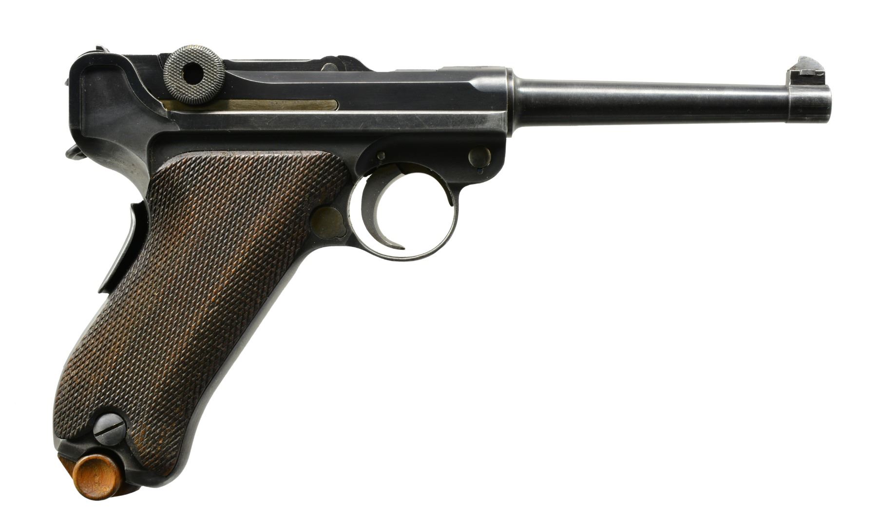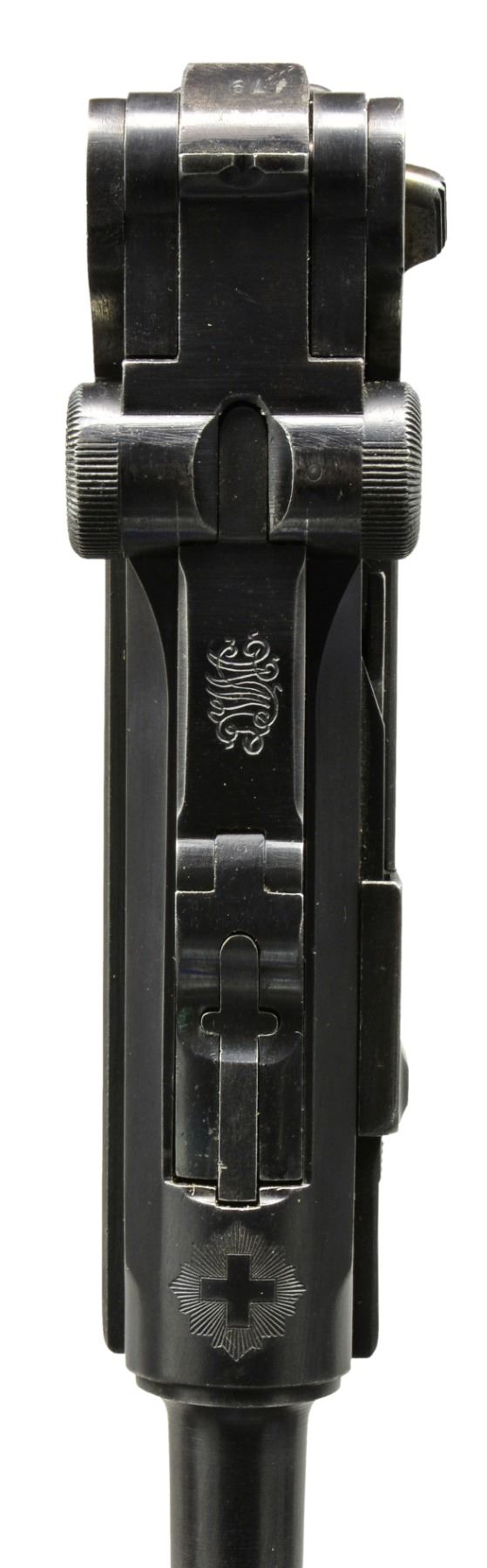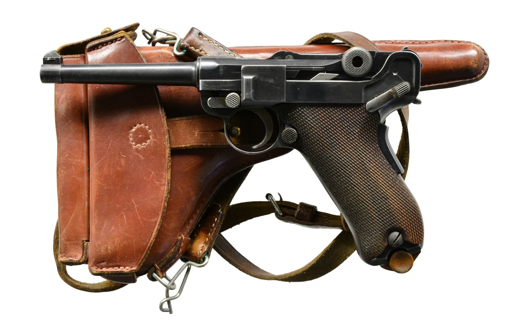 COMMERCIAL HOLSTER. Cal. 7.65mm Luger. S# 579v. Scarce Swiss Luger assembled by Mauser using DWM parts, circa 1934, in the desirable "v" suffix serial range, with commercial holster and strap. Standard configuration 1906 Swiss Luger having 4.75" barrel, drift adjustable front sight and "V" notch rear sight. Swiss Cross in Starburst on chamber. "DWM" middle toggle link. Full serial number on forward frame, last three digits on receiver lug; two digits on all the usual small parts. Firing pin, grip safety and grips are unnumbered. Crown/Crown/U proofs under the barrel, left receiver and breechblock. Major components blued. Trigger, takedown lever, extractor, ejector, magazine release button are strawed. Checkered grips. MAGS: good plus, unmarked, tinned with walnut plug, mar on base. UNATTACHED ACCESSORIES: near excellent, unmarked, cordovan commercial holster with added magazine pouch, ownership "Thomet" inked inside lid, with shoulder strap. CONDITION: VG+ original condition, with fading, especially on the front and backstraps that appear as a toned gray. Discreetly import marked using a fine laser etching method in an unobtrusive area. Comparable condition grips. Bright, near mirror-bore. Near excellent manual mechanics. One of the rarest Swiss Lugers that provides an interesting historical bridge between DWM and Mauser. PROVENANCE: From the esteemed collection of Paul Regnier, Switzerland. (20-1427/LA). CURIO. $3,500-6,500.