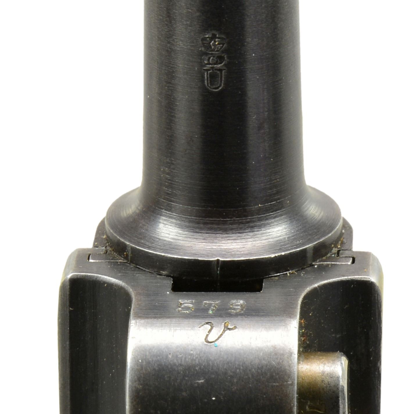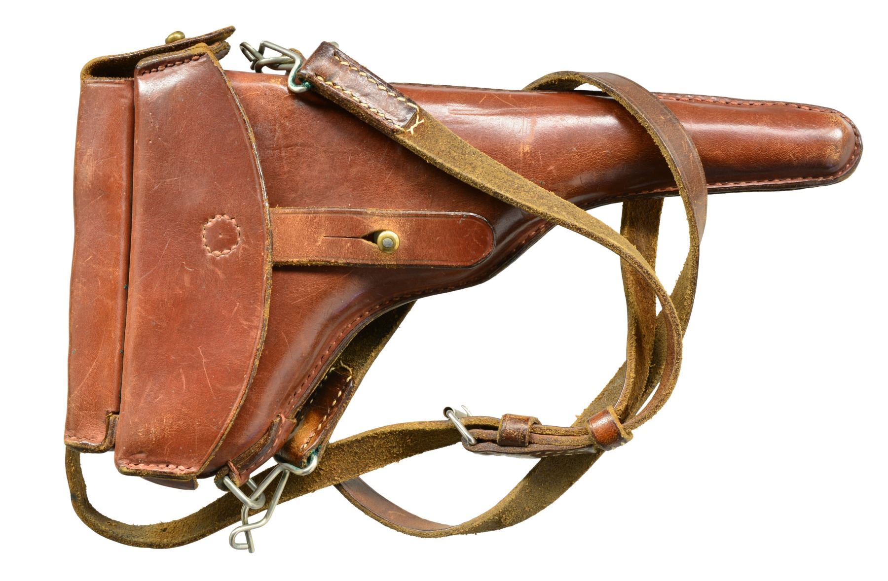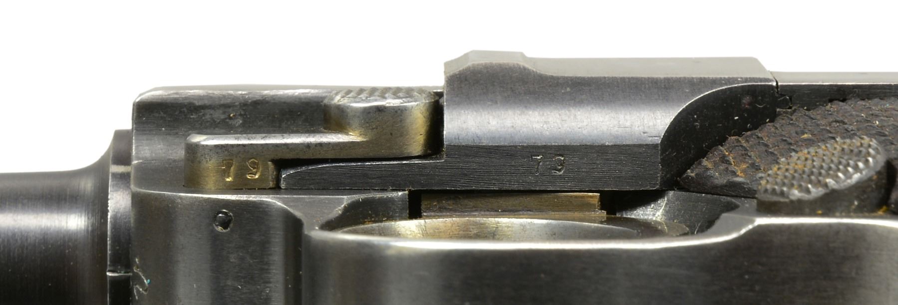 COMMERCIAL HOLSTER. Cal. 7.65mm Luger. S# 579v. Scarce Swiss Luger assembled by Mauser using DWM parts, circa 1934, in the desirable "v" suffix serial range, with commercial holster and strap. Standard configuration 1906 Swiss Luger having 4.75" barrel, drift adjustable front sight and "V" notch rear sight. Swiss Cross in Starburst on chamber. "DWM" middle toggle link. Full serial number on forward frame, last three digits on receiver lug; two digits on all the usual small parts. Firing pin, grip safety and grips are unnumbered. Crown/Crown/U proofs under the barrel, left receiver and breechblock. Major components blued. Trigger, takedown lever, extractor, ejector, magazine release button are strawed. Checkered grips. MAGS: good plus, unmarked, tinned with walnut plug, mar on base. UNATTACHED ACCESSORIES: near excellent, unmarked, cordovan commercial holster with added magazine pouch, ownership "Thomet" inked inside lid, with shoulder strap. CONDITION: VG+ original condition, with fading, especially on the front and backstraps that appear as a toned gray. Discreetly import marked using a fine laser etching method in an unobtrusive area. Comparable condition grips. Bright, near mirror-bore. Near excellent manual mechanics. One of the rarest Swiss Lugers that provides an interesting historical bridge between DWM and Mauser. PROVENANCE: From the esteemed collection of Paul Regnier, Switzerland. (20-1427/LA). CURIO. $3,500-6,500.