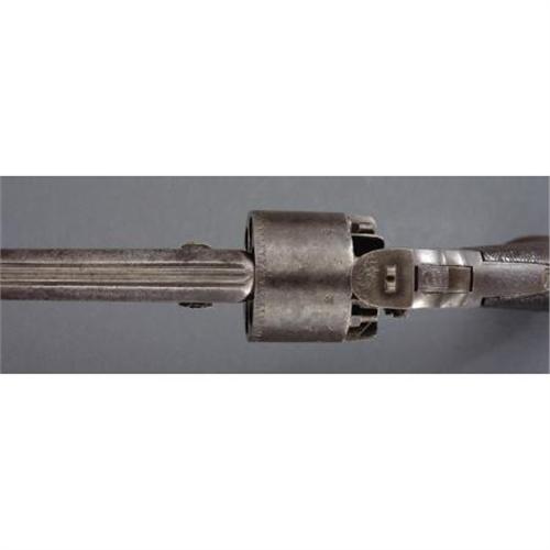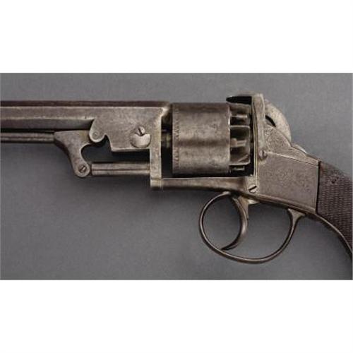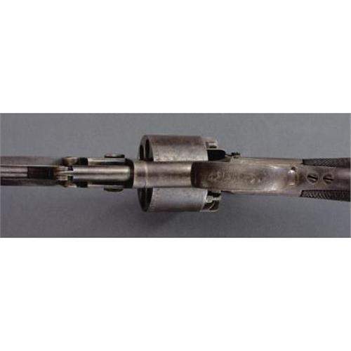 <B>HISTORIC REVOLVER INSCRIBED TO CONFEDERATE GENERAL JOHN HUNT MORGAN.</B></I> English percussion double action revolver of approximately .40 caliber by “Jas Worrall, Forgate St” which is neatly engraved on the left and right barrel flats respectively. Six shot cylinder with English proofs and each chamber with hand engraved number. The frame, butt cap, muzzle, hammer and trigger guard are exquisitely engraved with scroll motifs. The shield shaped silver escutcheon is inlaid at the back of the grip and bears the inscription “Gen/John/H./Morgan/Ky.” in tiny period script. Escutcheon unquestionably indigenous to the gun and the inscription is absolutely authentic and of the period. The revolver descended through the family of a soldier who served under Morgan and all pertinent correspondence as to the gun’s lineage is of course included. John Hunt Morgan was one of the Confederacy’s most brilliant and aggressive cavalry commanders whose specialty was what are best described, as guerilla actions behind federal lines. He was born in 1825 in Huntsville, Alabama and in 1831 the family moved to Lexington, Kentucky. Morgan served as a private in a US Cavalry regiment during the Mexican War seeing combat at Buena Vista. Upon his return he took over the family mercantile business and in the 1850s raised and led several militia companies in Lexington. Also, during those years, Morgan’s life was touched by tragedy with the death of his wife and infant son. In September 1861 Morgan, and the militia company he commanded, went to Tennessee and joined the Confederate Army. Soon after, Morgan raised the 2d Kentucky cavalry regiment which he commanded. Commissioned a brigadier on December 11, 1862 Morgan wreaked havoc with the supply lines of Gen. Rosecrans scoring a notable victory at the Battle of Hartsville. Hoping to divert Federal resources from the Confederate invasion of the north in mid 1863and the siege of the hard pressed garrison at Vicksburg Morgan set off on a campaign that would go down in the annals of Civil War history simply as “Morgan’s Raid”, although derisively known on the north at the time as the “Calico Raid”. Morgan experienced considerable success in the early stages of the operation, crossing the Ohio River and raiding through southern Ohio and Indiana, capturing thousands of Union soldiers. However, on July 19, 1863, while attempting to recross the Ohio into West Virginia, Morgan’s force was intercepted by Union gunboats resulting on the capture of 700 of his men with only 200 escaping. Most of these men would be interred in the infamous Union prison, Camp Douglas, where they would remain for the duration of the war. Morgan and his remaining men were finally forced to surrender, near Salineville, Ohio, on July 26. Remarkably, on November 27, 1863, Morgan and a number of his men were able to affect an escape from the Ohio Penitentiary, where they were being held, and return safely to the south. Although Morgan’s Raid captured the interest and imagination of the press, both north and south, it was, in the end, futile and the losses sustained by Morgan were of far greater importance than any of the damage he was able to inflict. After his return Morgan was relegated to command of Confederate forces in East Tennessee and West Virginia and on September 4, 1864 was surprised and killed during a Union cavalry raid on Greenville, Tennessee. Morgan is buried in Lexington. A rare opportunity to acquire an historic Civil War revolver, inscribed to, and doubtless used by, one of the South’s most dashing commanders. <BR><BR><B>Condition:</B></I> All metal with smooth dark patina mixing with traces of blue, just a few tiny patches of very light pitting. Mechanically perfect, excellent bore. Grips retain much of the original varnish with a couple of very minor hairlines but perfectly sound. Silver presentation plaque with wonderful untouched patina.<BR><BR><b>Shipping:</b> Requires 3rd Party Shipping (<a target="_blank" href="http://www.heritageauctions.com/common/shipping.php">view shipping information</a>)
