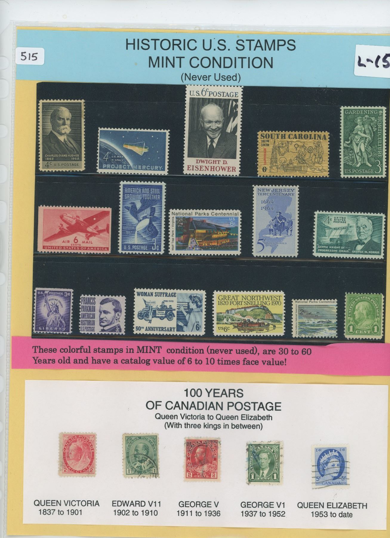 HISTORIC U.S STAMPS- 16 DIFFERENT- MINT CONDITION & SAMPLE STAMPS FOR 100 YEARS OF CANADIAN POSTAGE