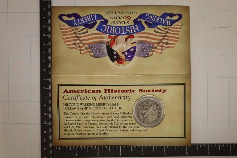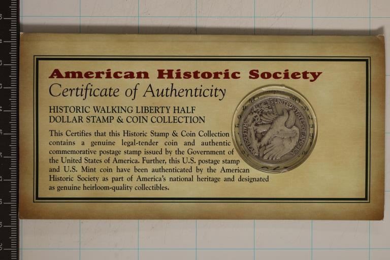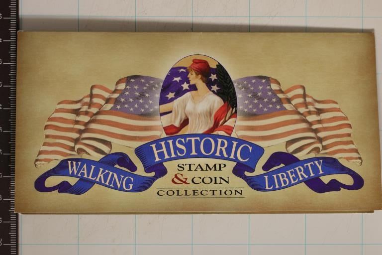 CONTAINS: 1935 SILVER WALKING LIBERTY HALF DOLLAR AND UNCANCELLED US THREE CENT STAMP IN FOLIO