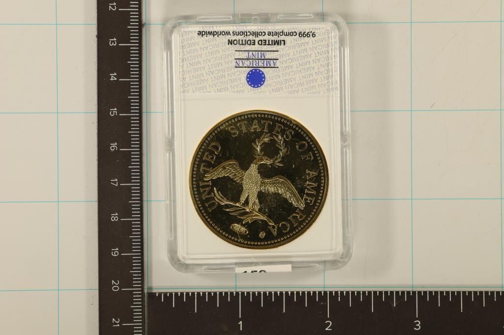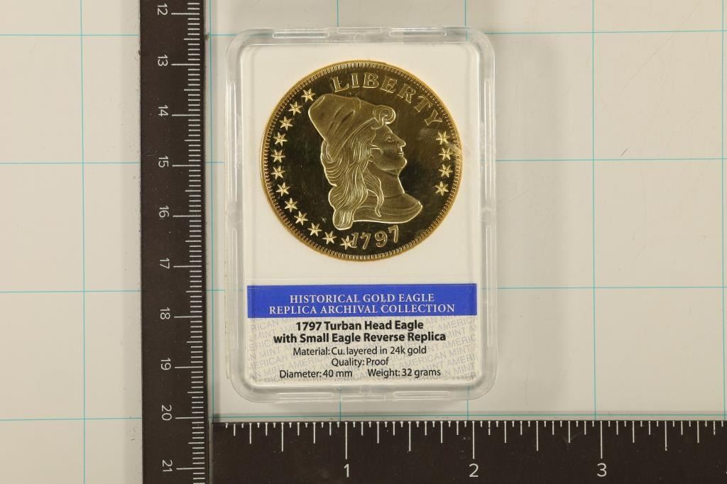 HEAD EAGLE WITH SMALL EAGLE REVERSE. LAYERED IN 24KT GOLD IN PROOF CONDITION, 32 GRAMS