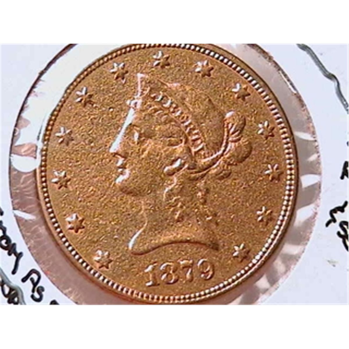 HISTORICAL SHIPWRECK GOLD 1879 $10 LIBERTY RECOVERY, VF20 This gold Eagle was recovered from the ocean beach at Sandy Hook, NJ. Slightly porous from the salt water.