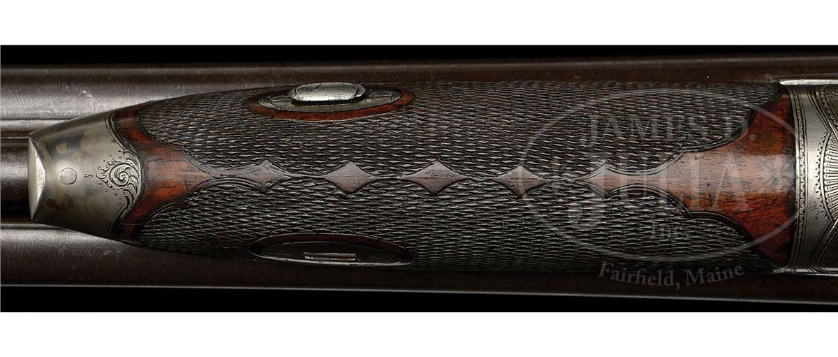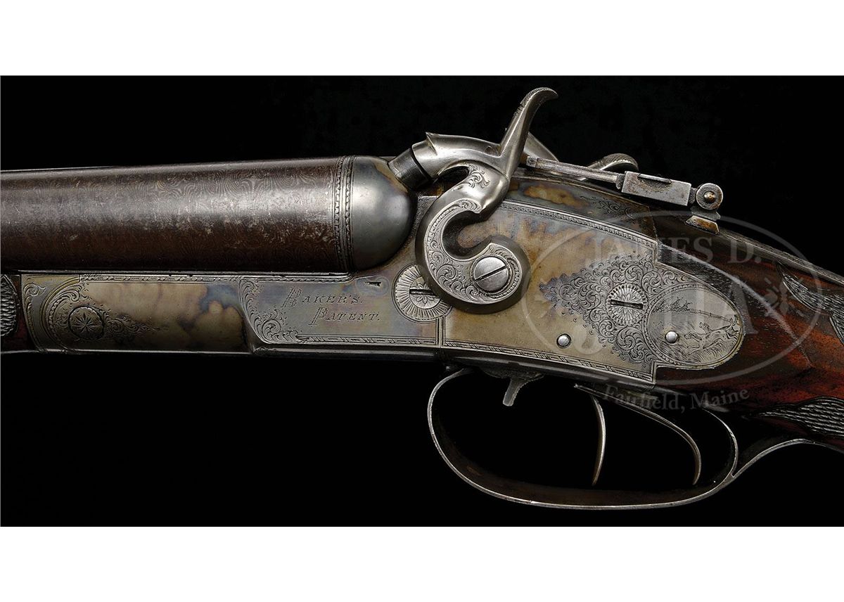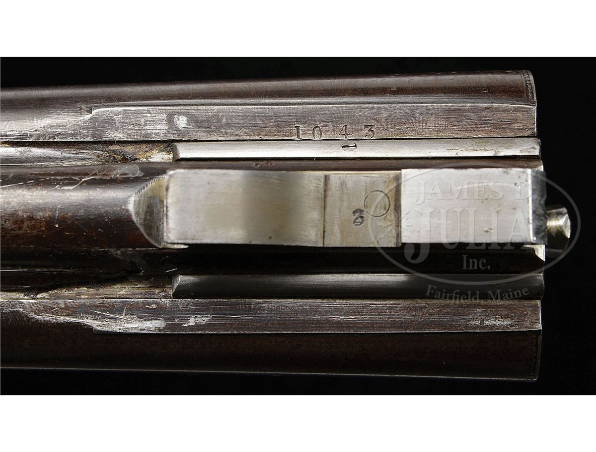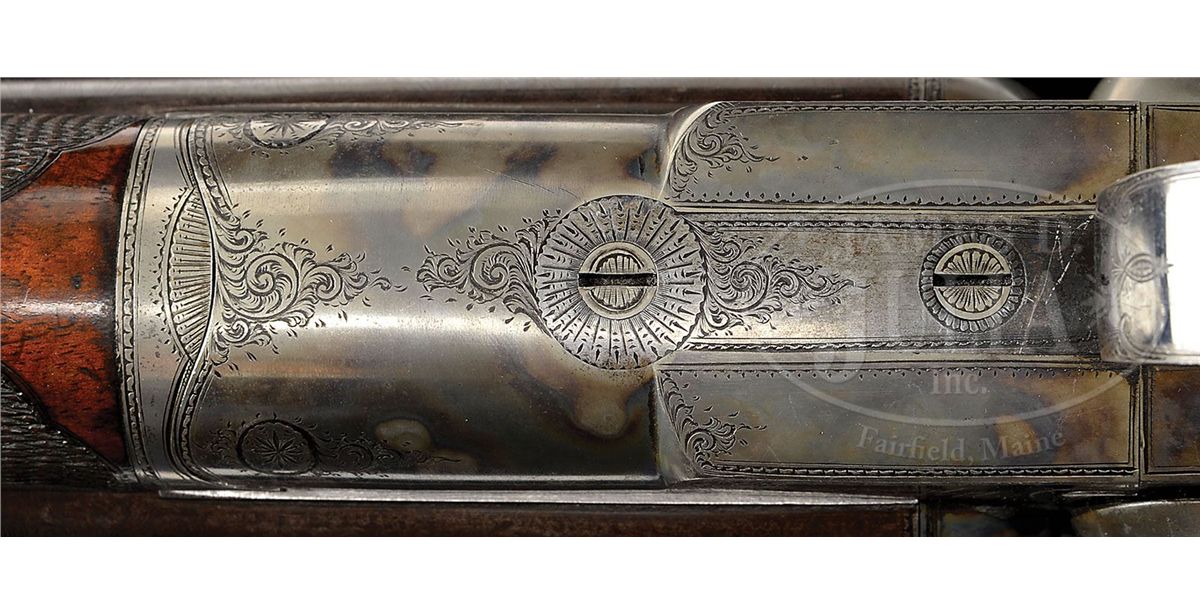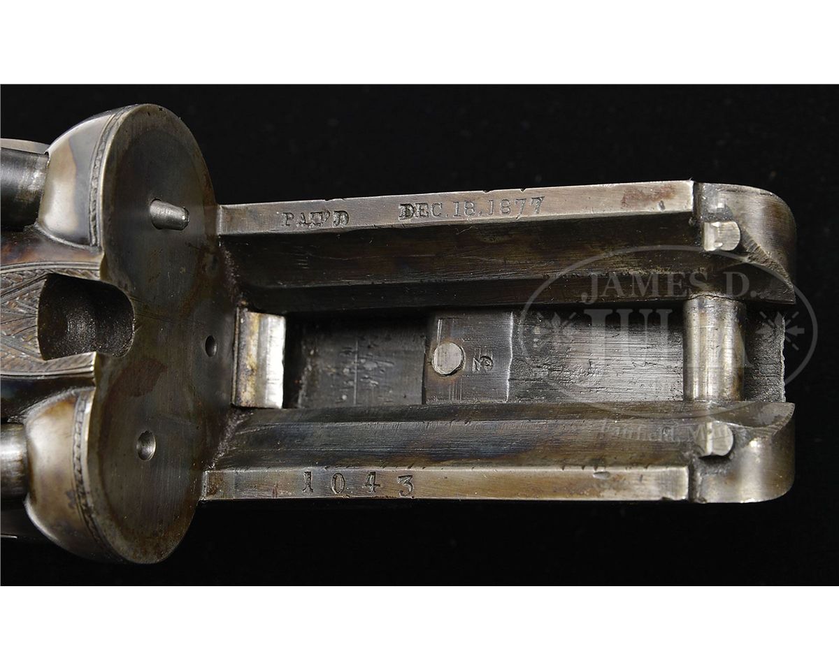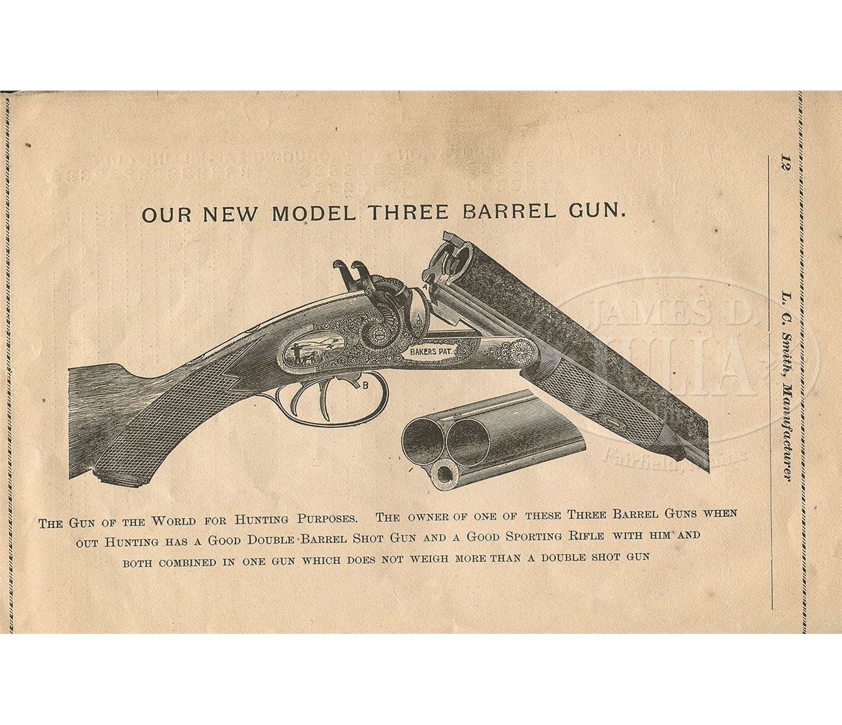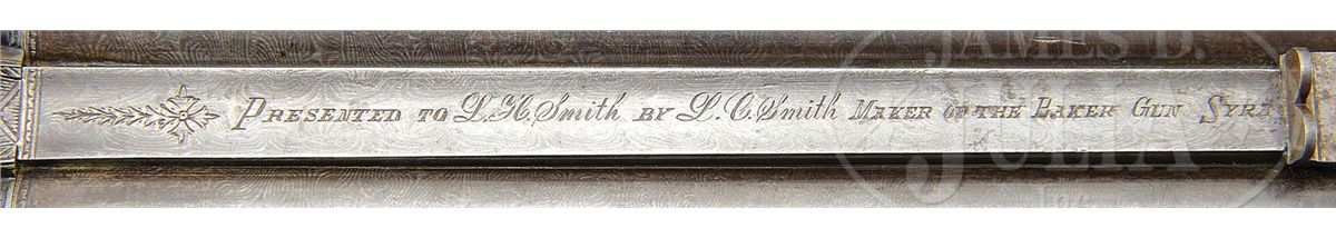 SN 1043 (1st year). Cal. 12 ga. x 12 ga x 38-55 (most are .44 cal). 30" Fine Damascus bbls are engraved "Presented to L. H. Smith by L. C. Smith Maker of the Baker Gun, Syracuse N. Y." on broad concave rib. One standing, one folding leaf buckhorn rear sight is dovetailed through "Syracuse". Small German silver blade front sight is set into rib. Bbl flats are stamped with SN and what appears to be "3". Although stamped as grade "3", engraving more approximates that found on grade "4" guns, and fancy checkering pattern eclipses that shown on catalog cut of a grade "5". This blending of features is not unusual on presentation guns. Unique case hardened action with locking lug actuated by pushing front trigger forward to open, has hammer boxlocks to fire shotgun bbls, and with rifle selector in front of front trigger, with rifle bbl being fired by rear trigger. A standard folding rear sight is on top tang. Action, hammers, and locks are engraved with exceptionally well cut small and medium scroll with geometric borders. Rear portions of locks have finely detailed oval vignettes of dogs in appropriate backgrounds, with a pair of hounds bounding into open meadow with fence line and copse in background on left side; and pair of alert setters in wooded background on right. "Bakers Patent" is on each side. Trigger guard bow depicts a standing buck with recumbent doe in meadow with evergreen background. Engraving is of the quality, and in the style of Jacob Glahn, but is unsigned. Beautifully figured and marbled European walnut full capped pistol grip buttstock measures 14" over checkered hard rubber buttplate. Checkering at grip is in fancy arcaded pattern, with double line borders. Matching splinter forend has heavy schnabled steel tip, and attaches to bbls with captive side nail through oval steel escutcheons. 12 ga. Bbls: Bore diameter: left-.745, right -.745. Bore restrictions: left -.025 with .004 recess (Full), right -.025 with no recess (Mod). Wall thickness: left -.032, right -.036. Drop at heel: 2-3/4", drop at comb: 1-5/8". Weight: 9 lbs. 1 oz. LOP: 14". PROVENANCE: This important gun was most likely presented by L. C. Smith to his brother L. H. Smith shortly after forming the L. C. Smith Co. and is therefore a gun of great historical interest. Included with gun is an exceptionally rare 1885 L. C. Smith catalog (9" x 6"), depicting the Smith double gun on the cover, but with woodcut and info on the Baker Patent 3 bbl gun inside. Also included is the original L. C. Smith production ledger for 1880 through 1887 listing number and type of guns produced per month. Along with a tally of the amount of sales per year and an exceptionally rare note signed by "LCS" on Lyman C. Smith letterhead, when giving the ledger book to "George", likely his brother-in-law George Livermore and co-founder of Ithaca Gun Co. The above is noted in Brophy's L.C. SMITH SHOTGUN book on pp 7 & 46. Also included is copy of THE ITHACA GUN COMPANY FROM THE BEGINNING by Walt Snyder in which he outlines the history of the company and the impact of the Smith family. This particular gun is mentioned on page 222 as the first entry under historically significant guns from the Ithaca Museum. CONDITION: Near Excellent. Bbls retain approx 80% of their orig brown finish, with fine definition to Damascus pattern. Action and locks retain over 90% orig case hardening color, which is vivid where protected, silvering slightly on forend iron, sharp edges, and top tang. Hammers are cleaned silver, left with nearly invisible repair at neck. Blue of trigger plate is considerably flaked at front. Trigger guard retains most of its bright blue, flaking slightly at bow and considerably at grip. Stocks retain nearly all of their French polish finish, worn through at high edges, and a bit frosted, with a number of light marks and scratches. Buttplate has 5/8" chip at toe. Bores are excellent. Rifle bore is sharp and shiny throughout. Action is tight. Left firing pin is broken. A unique opportunity for advanced collector to acquire the "Grandfather" of L.C. Smith Shotguns and rare related personal artifacts from the Smith family. 4-48906 MGM171