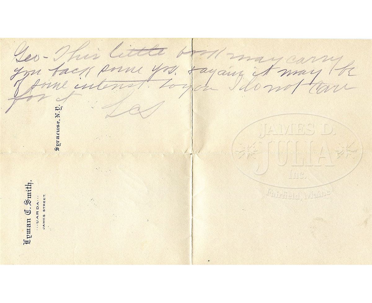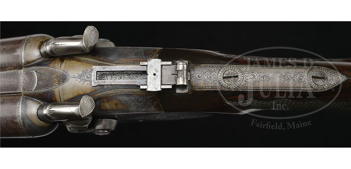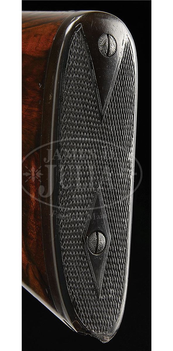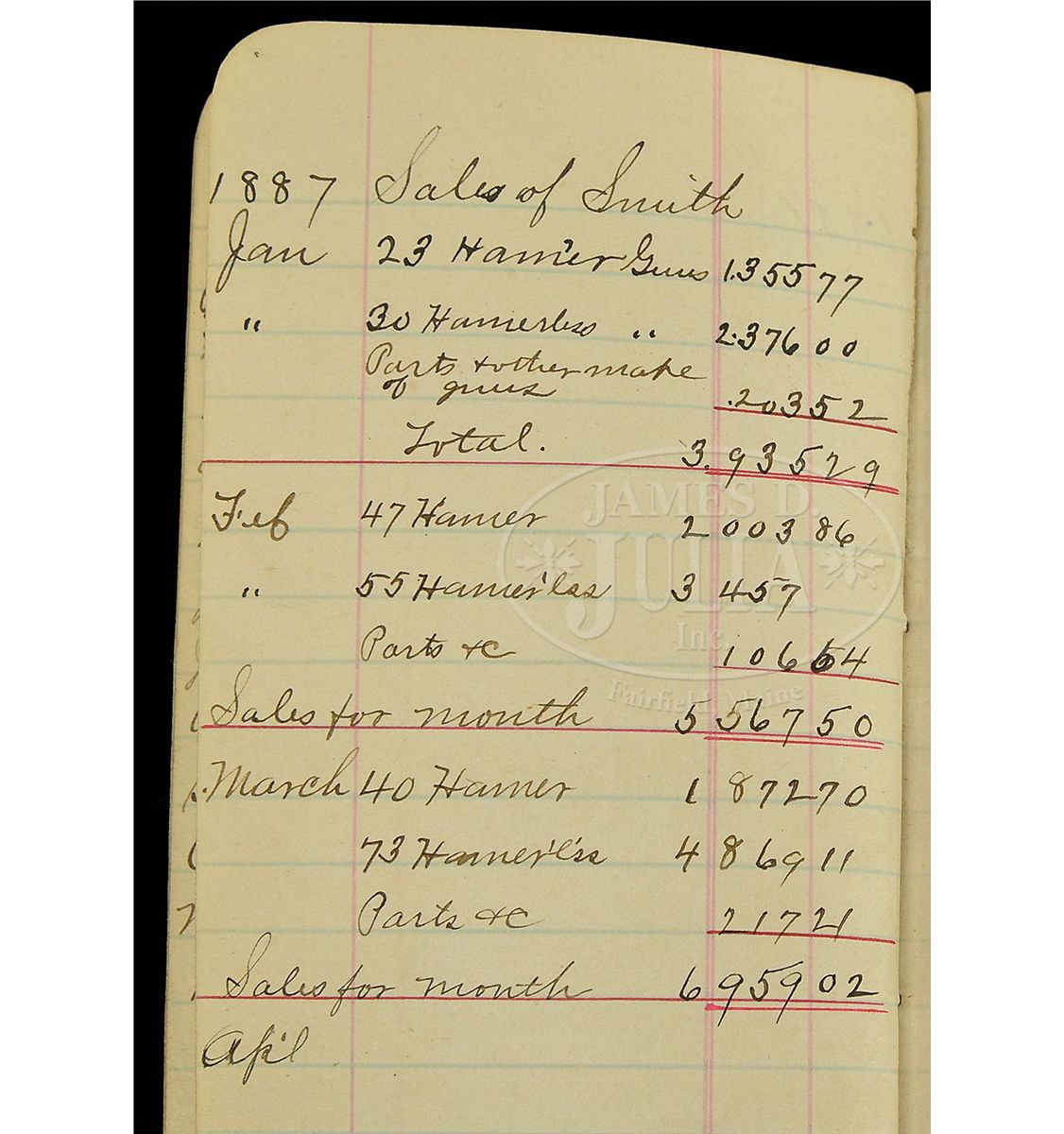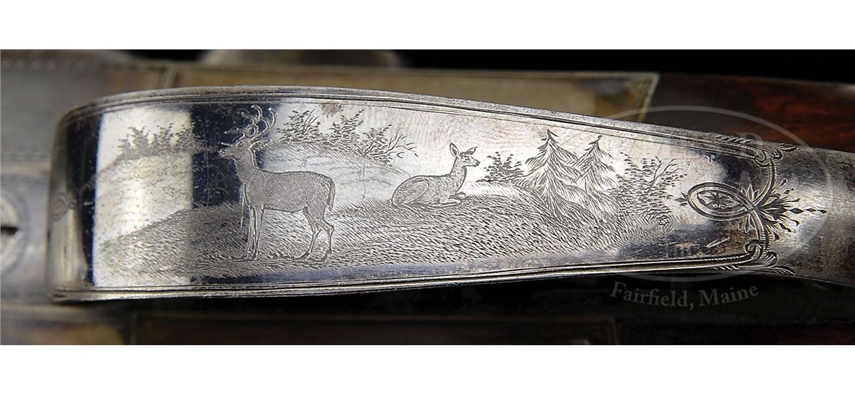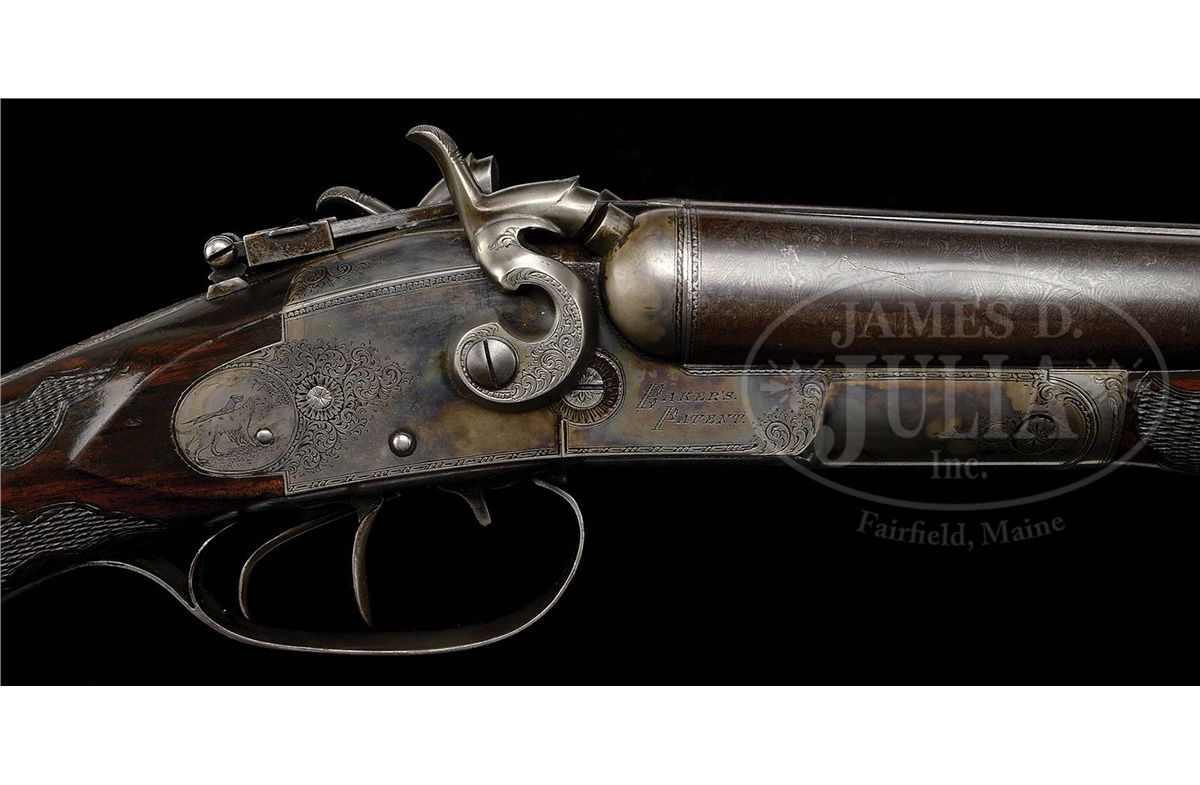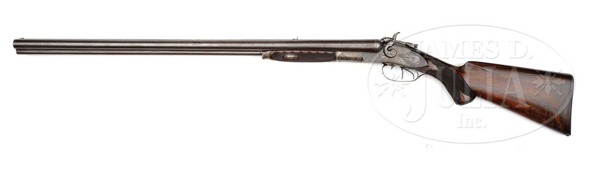 SN 1043 (1st year). Cal. 12 ga. x 12 ga x 38-55 (most are .44 cal). 30" Fine Damascus bbls are engraved "Presented to L. H. Smith by L. C. Smith Maker of the Baker Gun, Syracuse N. Y." on broad concave rib. One standing, one folding leaf buckhorn rear sight is dovetailed through "Syracuse". Small German silver blade front sight is set into rib. Bbl flats are stamped with SN and what appears to be "3". Although stamped as grade "3", engraving more approximates that found on grade "4" guns, and fancy checkering pattern eclipses that shown on catalog cut of a grade "5". This blending of features is not unusual on presentation guns. Unique case hardened action with locking lug actuated by pushing front trigger forward to open, has hammer boxlocks to fire shotgun bbls, and with rifle selector in front of front trigger, with rifle bbl being fired by rear trigger. A standard folding rear sight is on top tang. Action, hammers, and locks are engraved with exceptionally well cut small and medium scroll with geometric borders. Rear portions of locks have finely detailed oval vignettes of dogs in appropriate backgrounds, with a pair of hounds bounding into open meadow with fence line and copse in background on left side; and pair of alert setters in wooded background on right. "Bakers Patent" is on each side. Trigger guard bow depicts a standing buck with recumbent doe in meadow with evergreen background. Engraving is of the quality, and in the style of Jacob Glahn, but is unsigned. Beautifully figured and marbled European walnut full capped pistol grip buttstock measures 14" over checkered hard rubber buttplate. Checkering at grip is in fancy arcaded pattern, with double line borders. Matching splinter forend has heavy schnabled steel tip, and attaches to bbls with captive side nail through oval steel escutcheons. 12 ga. Bbls: Bore diameter: left-.745, right -.745. Bore restrictions: left -.025 with .004 recess (Full), right -.025 with no recess (Mod). Wall thickness: left -.032, right -.036. Drop at heel: 2-3/4", drop at comb: 1-5/8". Weight: 9 lbs. 1 oz. LOP: 14". PROVENANCE: This important gun was most likely presented by L. C. Smith to his brother L. H. Smith shortly after forming the L. C. Smith Co. and is therefore a gun of great historical interest. Included with gun is an exceptionally rare 1885 L. C. Smith catalog (9" x 6"), depicting the Smith double gun on the cover, but with woodcut and info on the Baker Patent 3 bbl gun inside. Also included is the original L. C. Smith production ledger for 1880 through 1887 listing number and type of guns produced per month. Along with a tally of the amount of sales per year and an exceptionally rare note signed by "LCS" on Lyman C. Smith letterhead, when giving the ledger book to "George", likely his brother-in-law George Livermore and co-founder of Ithaca Gun Co. The above is noted in Brophy's L.C. SMITH SHOTGUN book on pp 7 & 46. Also included is copy of THE ITHACA GUN COMPANY FROM THE BEGINNING by Walt Snyder in which he outlines the history of the company and the impact of the Smith family. This particular gun is mentioned on page 222 as the first entry under historically significant guns from the Ithaca Museum. CONDITION: Near Excellent. Bbls retain approx 80% of their orig brown finish, with fine definition to Damascus pattern. Action and locks retain over 90% orig case hardening color, which is vivid where protected, silvering slightly on forend iron, sharp edges, and top tang. Hammers are cleaned silver, left with nearly invisible repair at neck. Blue of trigger plate is considerably flaked at front. Trigger guard retains most of its bright blue, flaking slightly at bow and considerably at grip. Stocks retain nearly all of their French polish finish, worn through at high edges, and a bit frosted, with a number of light marks and scratches. Buttplate has 5/8" chip at toe. Bores are excellent. Rifle bore is sharp and shiny throughout. Action is tight. Left firing pin is broken. A unique opportunity for advanced collector to acquire the "Grandfather" of L.C. Smith Shotguns and rare related personal artifacts from the Smith family. 4-48906 MGM171