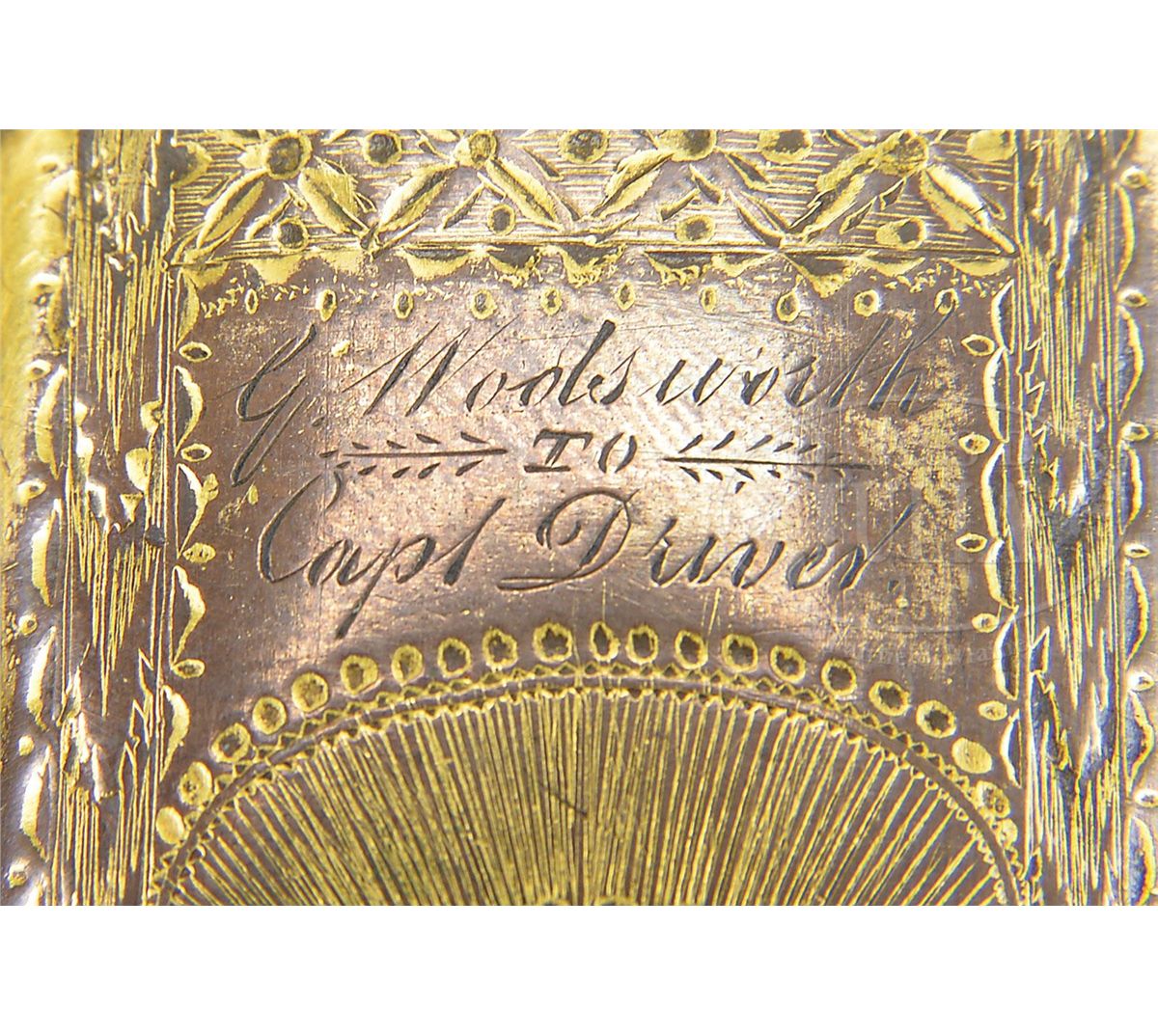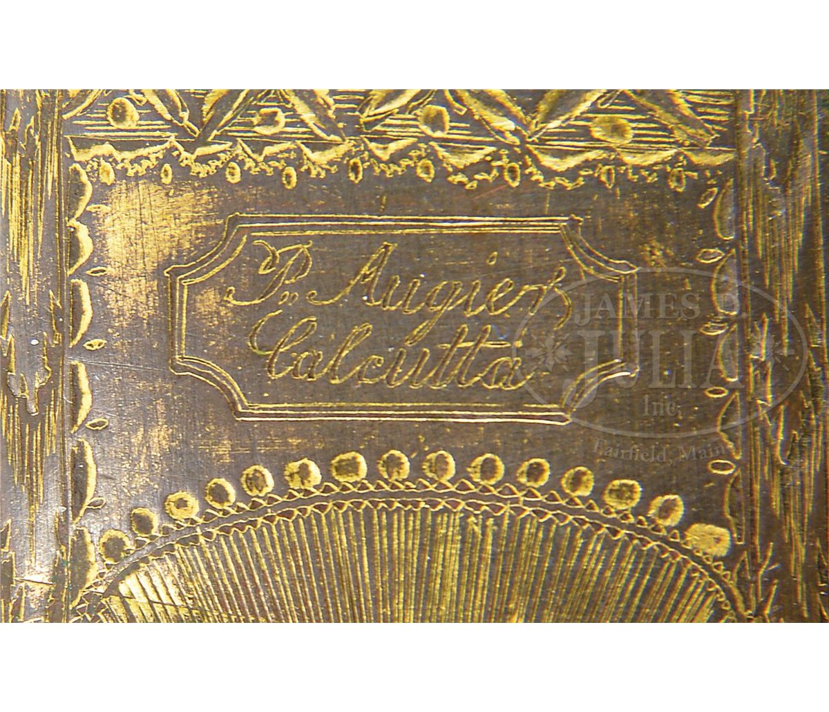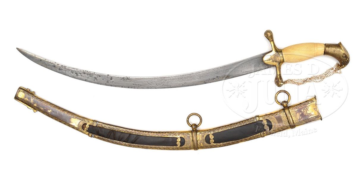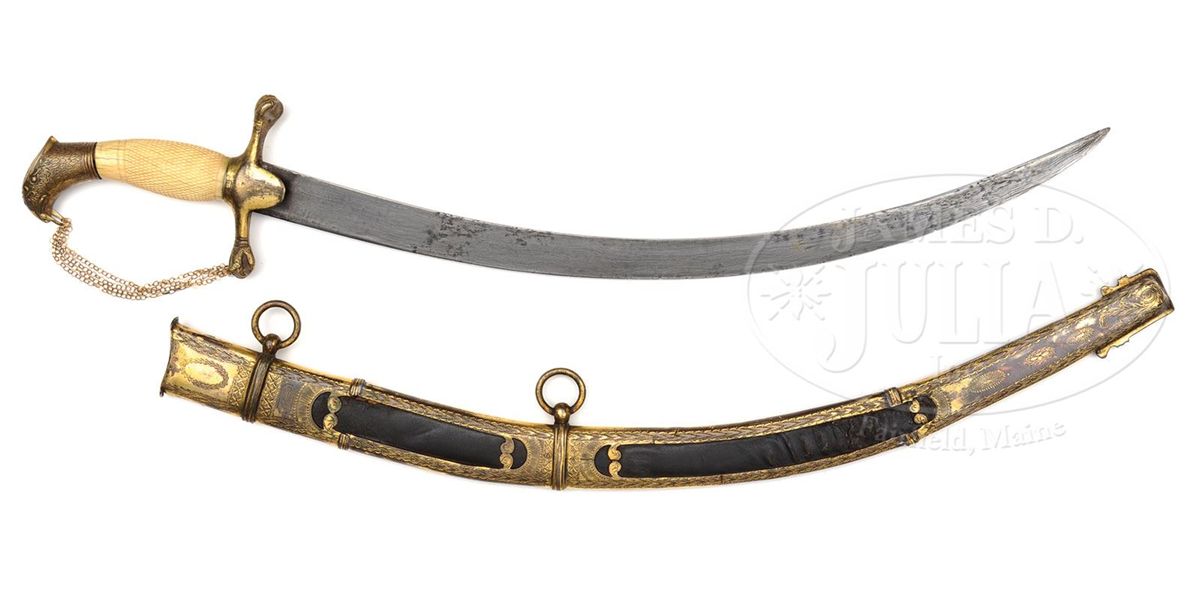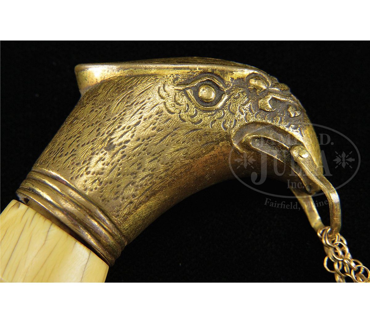 This is one of the most historically important naval presentation dirks extant. The pommel is of a long necked eagle, the beak’s mouth in one slash. The head has long feathers, and the neck and back have diamond shapes. The grip is of finely checkered ivory and the leather scabbard has beautifully engraved gilt copper mounts. Deeply curved blade is of Damascus steel. The locket is period engraved: “G.Wodsworth to Captain Driver.” The maker’s signature is P. Augier, Calcutta. A sword, perhaps matching but not presented appears on the cover of Silver Mounted Swords The Latimer Family Collection by Daniel D. Hartzler. This sword is silver mounted and signed “I. KUCHER PHILADELPHIA” but the absolute similarities with Captain Driver’s dirk as well as the Damascus blade prove it to be of Indian manufacture retailed by Kucher (Figure 410, page 244). William Driver was a sea captain from Salem, Massachusetts born 17 March 1803.At 14 he signed on as a ship’s boy on the “China”. For the next several years he shipped out of Salem to Calcutta and became a trading officer. In 1831, his mother and the women of Salem gave him an American flag, nine and one half feet by seventeen feet for his ship “Charles Doggert”. As Captain Driver watched it rise to the mast for the first time he said he would call the flag “Old Glory”. When Captain Driver made landfall in Tahiti he was asked by 65 descendants of the Bounty mutineers to return them to Pitcarin Island. Responding to their plight Captain Driver made the 1400 mile unscheduled voyage at great personal expense and risking his maritime insurance. For this incredibly generous act Captain Driver was held in high esteem by the English and doubtless was presented with this magnificent and impressive dirk by the English Solicitor of Bengal Province. Captain Driver retired from the sea in 1837 and settled in Nashville. On July 4th the Captain would display Old Glory from a rope between his house and a tree across the street. After Tennessee seceded in 1861 Captain Driver hid Old Glory from the Confederates. When the Union Army entered Nashville on February 25, 1862 Captain Driver carried Old Glory to the Capitol and raised it on the Capitol flagpole guarding it all through that night. By an Act of Congress the American flag flies over Captain Driver’s grave site together with the grave site of Francis Scott Key 24 hours a day. In 1922 Driver’s family sent Old Glory to the Smithsonian Institution. Old Glory and The Star Spangled Banner are the two most historically significant American flags. PROVENANCE: Accompanied by extensive folder of documents including Wodsworth family records and other provenance. The Old Glory Driver Dirk is a piece of our nation’s very fabric and represents an opportunity for the private collector or public institution to acquire an object of national importance. CONDITION: The copper mounts retain considerable original gilding. Blade shows good Damascus pattern with some erosion to be expected from sea service. Leather is original and substantially intact. Presentation engraving is legible. Ivory grip exhibits crisp checkering with very minor losses. Chains replaced. 4-49292 MRZ111