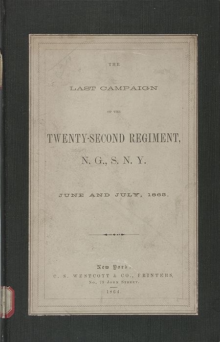 A rare war-date Union regimental history, 47pp. hardbound 8vo., entitled: The LAST CAMPAIGN of the TWENTY-SECOND REGIMENT, N. G. S. N. Y. June and July, 1863, C. S. Westcott, No. 79 John Street, NYC, 1864. The unit's trials and tribulations during the campaign are recounted in full and include an almost unknown clash with the rebel infantry at Carlisle, Pennsylvania described here in very small part: "…for the purpose of protecting our flanks, it was requisite that out-lying pickets…should be sent as far out as they could go…the cavalry detailed for that duty refused to perform it…a portion of the artillery was so near that the commands of the officers could be distinctly heard…some time before dawn, preparations were made to receive the attack…the general expectation…was to find the town a heap of ruins…the citizens, concealed in their cellars, and the soldiers lying flat behind cemetery walls and in the fields, had almost entirely escaped the iron tempest…a few of the reserves…suffered heavily; the Thirty-Seventh…had some hurt…". Much more interesting content. Ex-Mollus, Commander of the State of Illinois, very good.