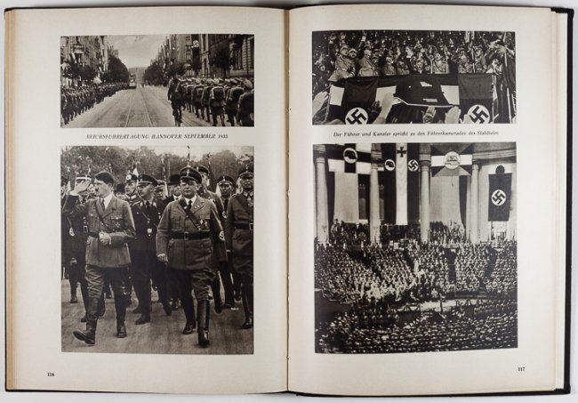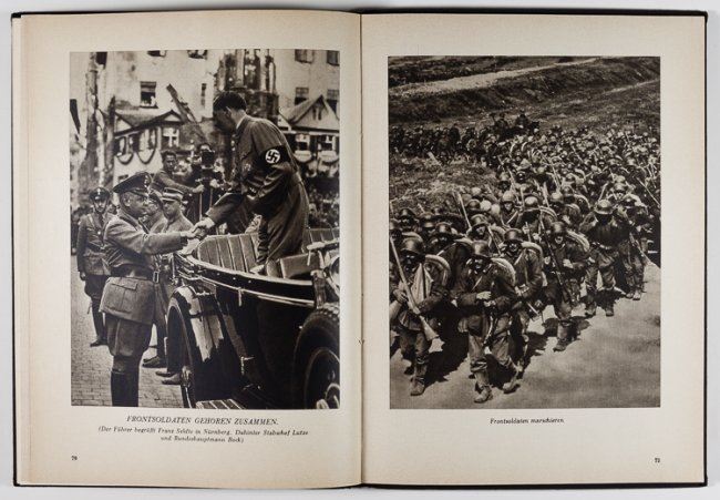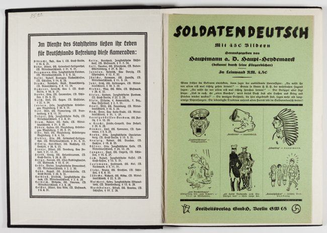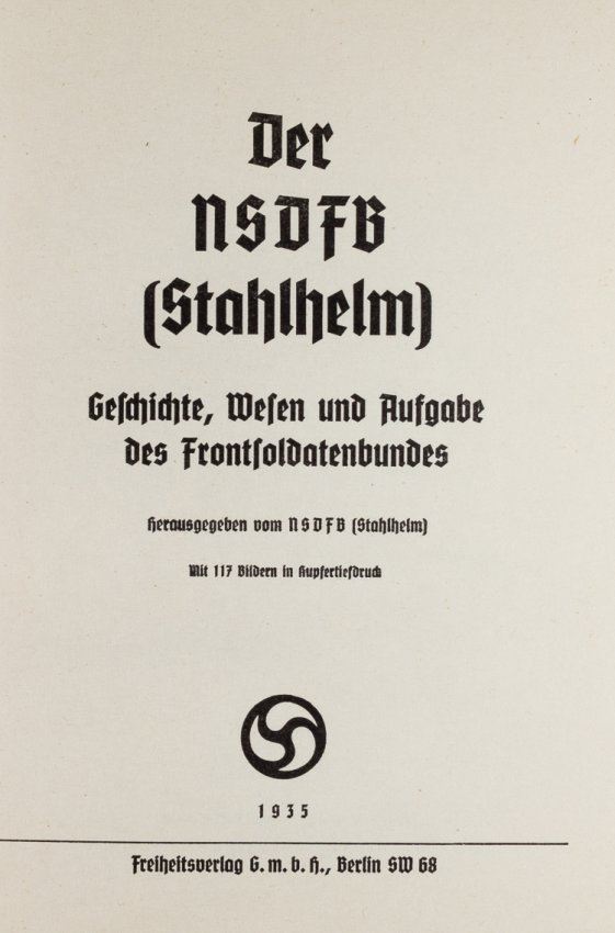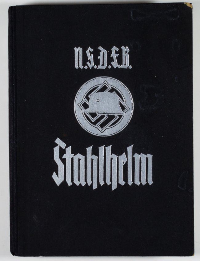 A German-issued history of the Stahlhelm: "Der NSDFB (Stahlhelm)" (Berlin: Freiheitsverlag), 1935. 192pp. 8vo., silver-imprinted black cloth covers. A history of the Stahlhelm which helped bring Hitler to power, with 128 pages of illustrations at the rear of the book. Also present is a flyer, 2pp. 8vo., on the proper way in which a Stahlhelm member should conduct himself. One corner bumped, else fine.