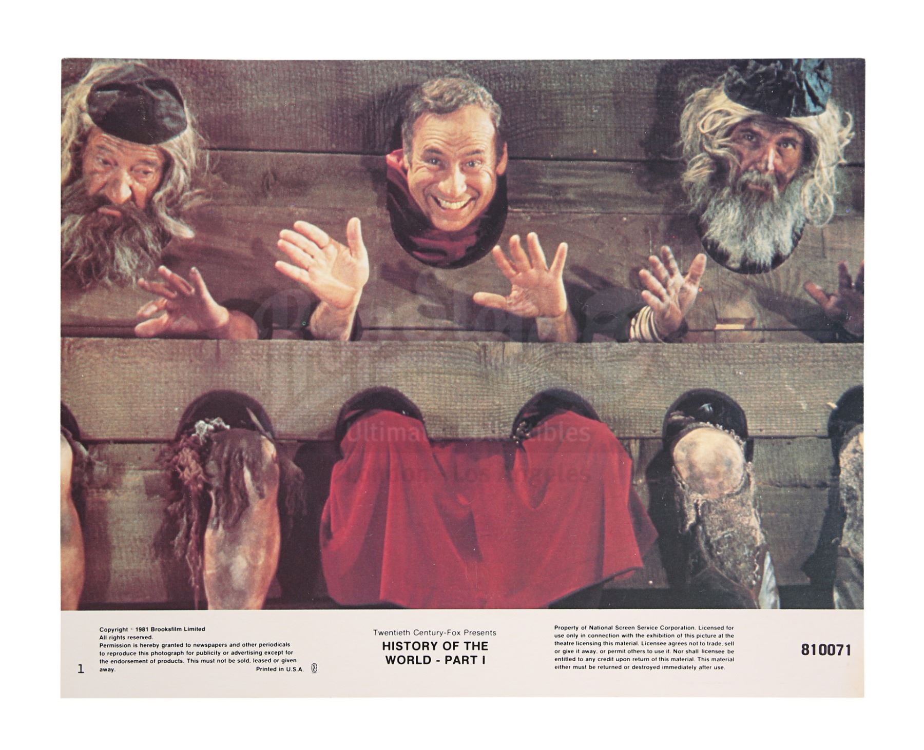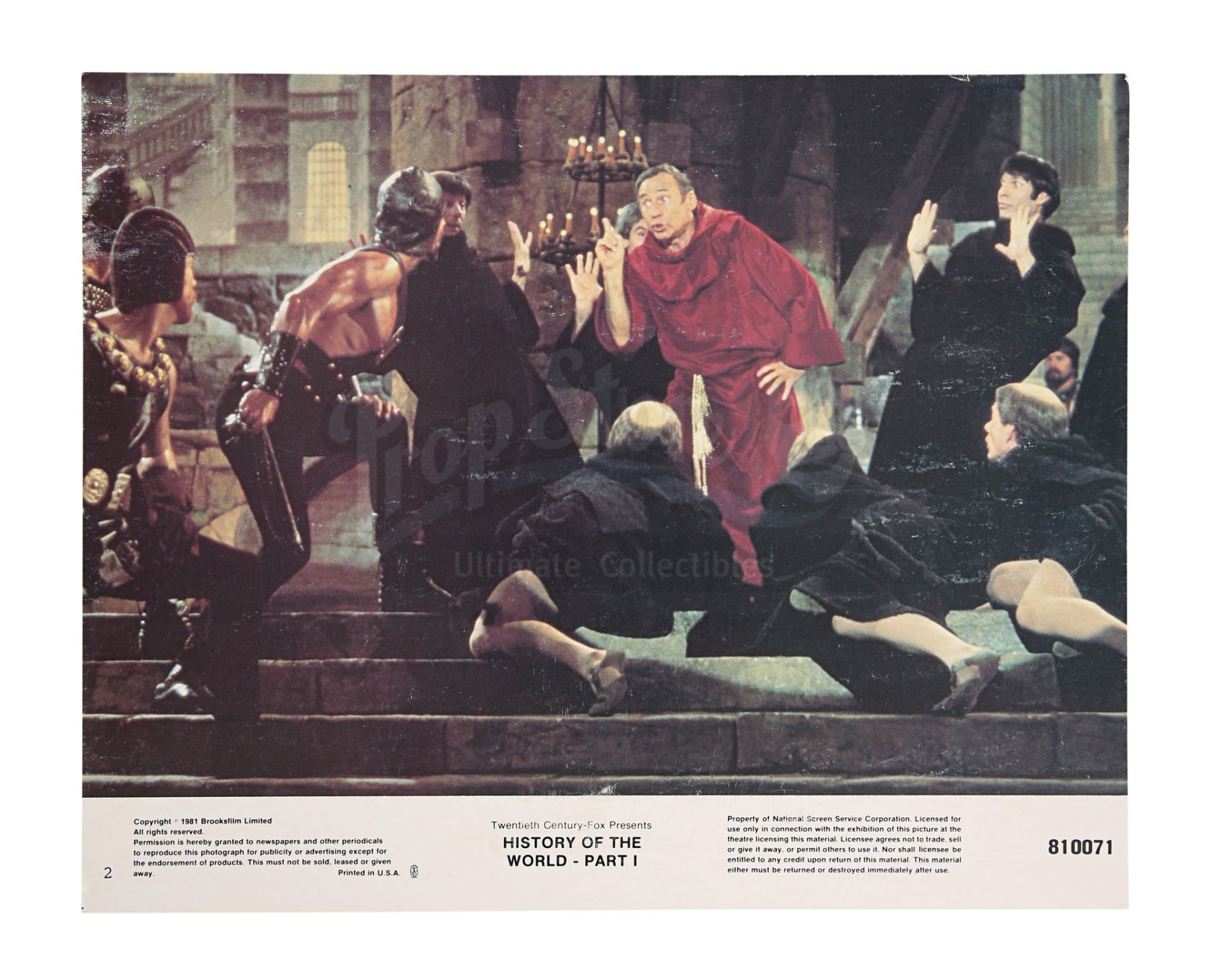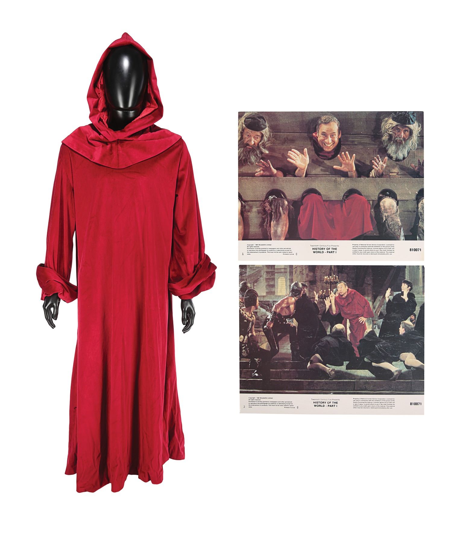 Torquemada's (Mel Brooks) inquisitor robe from Brooks' historical comedy History of the World: Part 1. Torquemada wore his robe during the big musical number about the Spanish Inquisition, which featured tap-dancing monks and synchronised-swimming nuns. Torquemada's floor-length robe is made of red velvet and features a hood, which contains a small metal weight to help keep its shape. An Ital Costume label inside the collar reads "Mr. Brooks". The costume has some wear from production use and age, including some plucked fibres and loose threads, most notably around the hem and sleeves. The lot is accompanied by two original 8" x 10" lobby cards featuring Brooks wearing the robe.