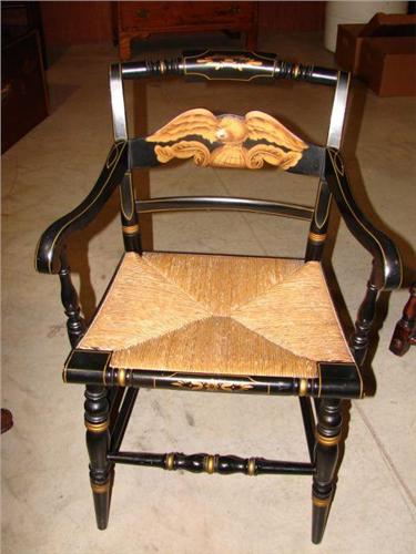 HITCHCOCK ARM CHAIR. Ebonized and gilt decorated with eagle at back rest. Rush bottom seat. Marked on back “L. Hitchcock, Hitchcocksville, Conn. Warranted”. 34” H to top of back