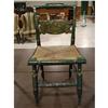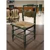PAINT DECORATED HITCHCOCK SIDE CHAIR. Rush bottom. Green painted with gilt painted fruit basket at middle splat at back rest. Marked at back of seat. 34” H to top of back.