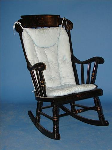 HITCHCOCK STYLE ROCKER. Black & gilt painted with stenciled gilt fruit & urn decoration at top of back. Marked on bottom with Fallon & Hellen label & branded on bottom “S. Rent & Sons, Inc.” 41” H to top of back.