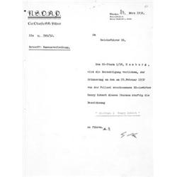 (1889 - 1945) Fuhrer of Germany and Nazi Party leader, Hitler's bloody rise to power, his military seizure of most of Europe and North Africa and his genocidal racial policies culminated in suicide in his Berlin bunker as Russian troops approached. Fine content D.S.1p. 4to., [n.p.], June12,1931, in German. In this early document, Hitler, "in the tradition of the SS", bestows an honor upon two of SS units, one from Munich, the second from Bavaria, designating them "Sturm Casella" and "Sturm Faust" respectively.Boldy signedin pencil, also initialed "R" by his chief of staff, ERNST rohm (1887 - 1934) Nazi Brownshirt who organized, trained and headed the SA, a friend of Hitler who was at his side in the 1923 Beer Hall Putsch, later set-up and executed by Hitler following their disagreement on the use of the 2 million-strong SA. Margins chipped with no loss of text, 1" spot clear ofsignature,overall quite good.A rare association!