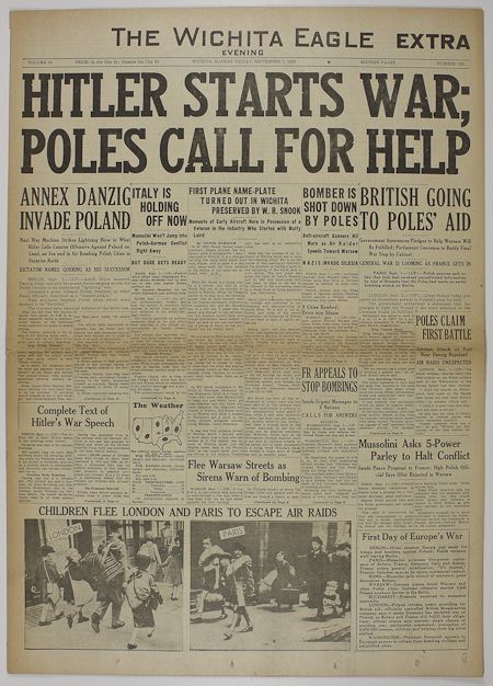 The Wichita Eagle Extra, Wichita, Ks., Sep. 1, 1939, Evening edition, 16pp. bearing a bold headline as Hitler invades Poland. Hitler's attack commenced on Sep. 1, the same day the Eagle went to press. Quotes include "Nazi War Machine Strikes Lightning Blow", and "British Going To Poles Aid". At the bottom of the front page are two photographs of men and women fleeing London and Paris in fear of air raids. Other content pertains to a German bomber being shot down by Polish anti aircraft guns, Poles fleeing Warsaw streets, and more. An historic new paper. Light toning at fold, else fine.