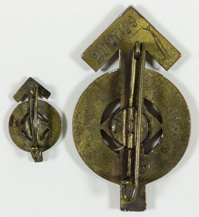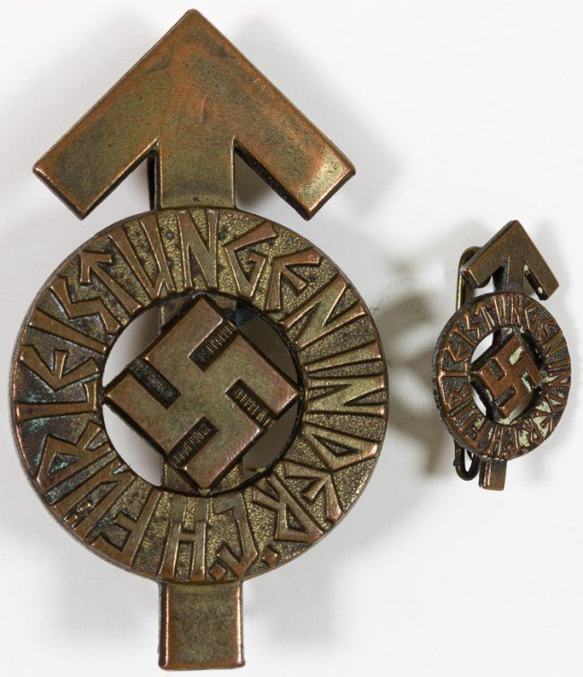 Hitler Youth Achievement Badge in Bronze, numbered ?202799? and maker-stamped on verso, sold with a smaller lapel-pin version of the same badge. Very good.