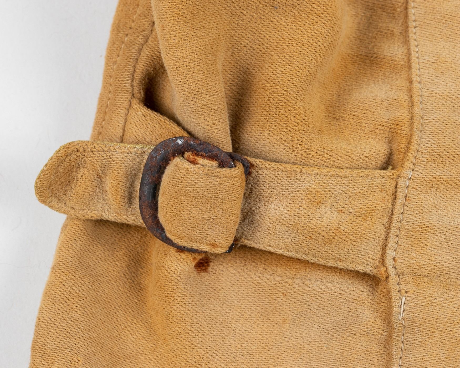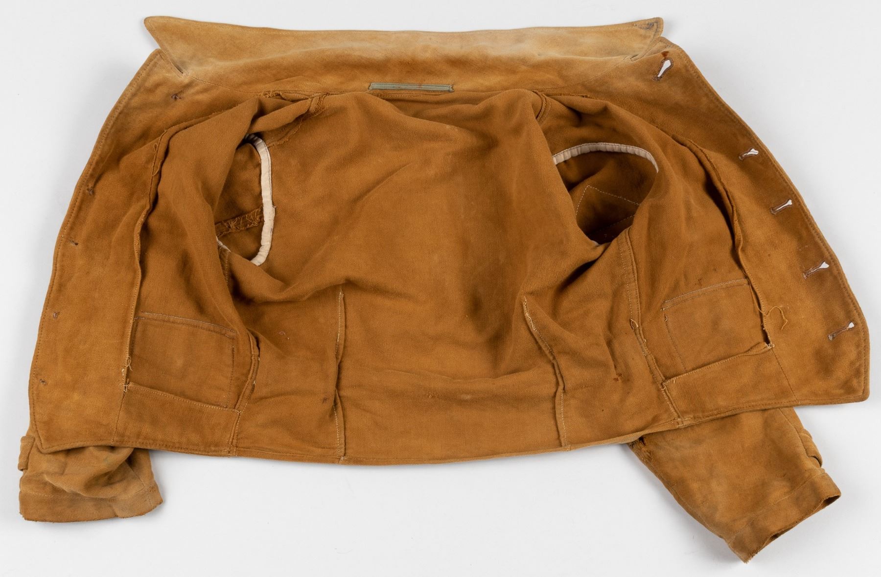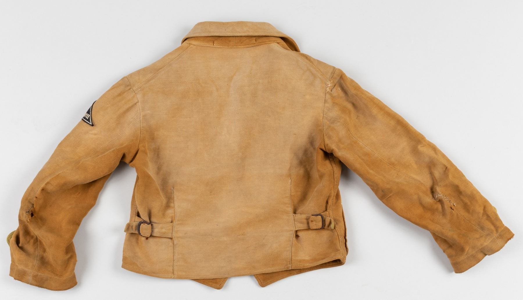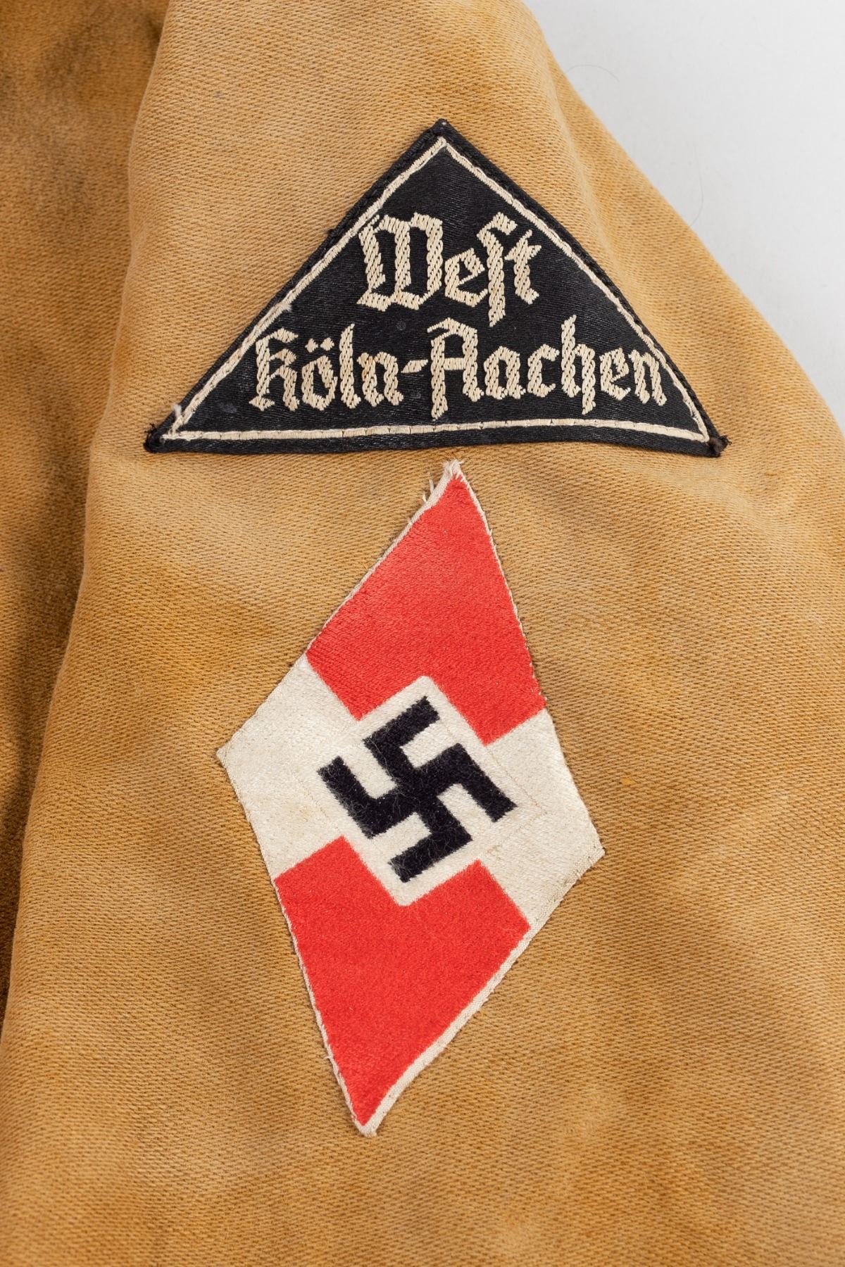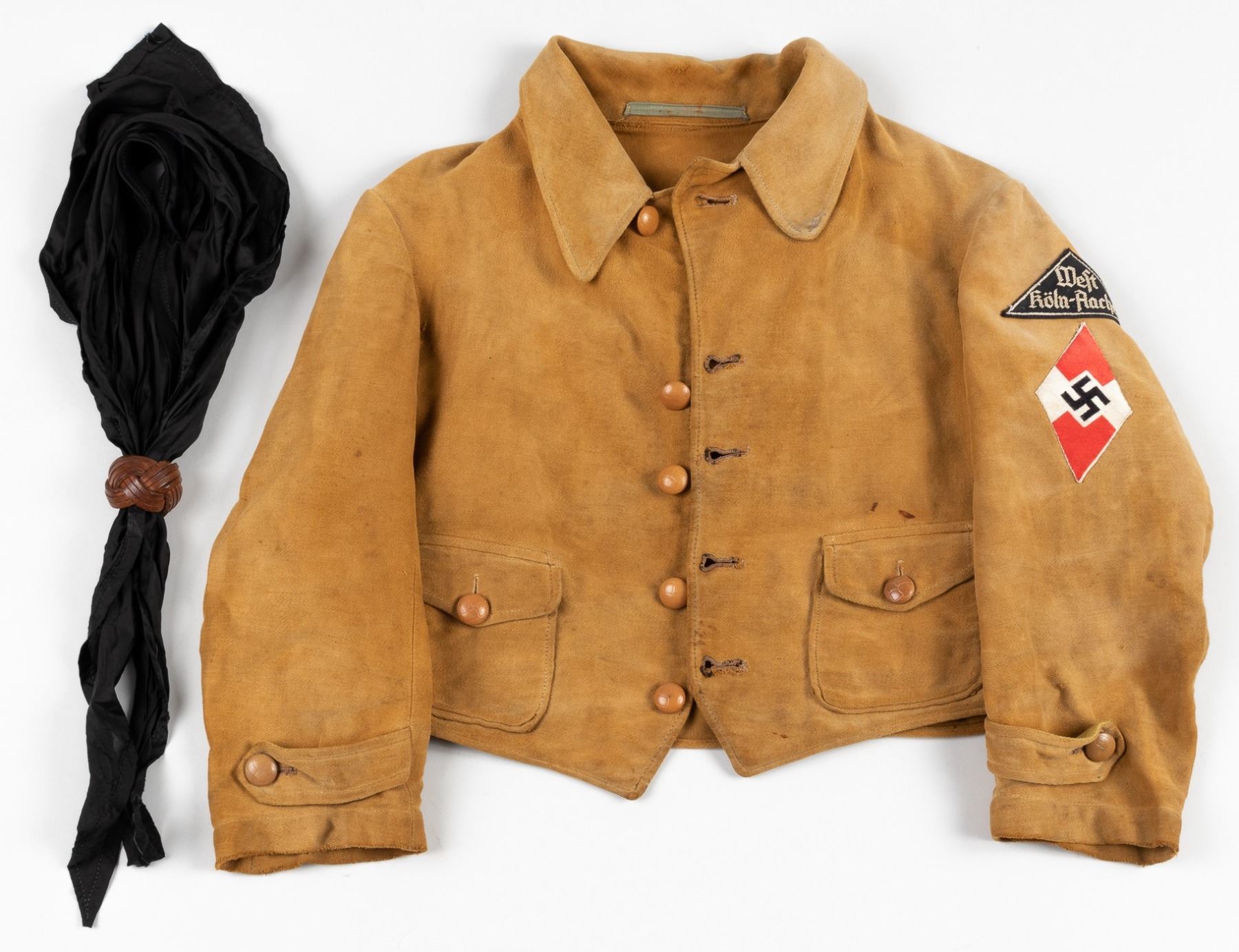 Hitler Youth BDM little girl's jacket, sewn to the left arm are a Hitler Youth diamond a sleeve patch and a 'West Koeln-Aachen' regional triangle sleeve patch. Small tan buttons down center of jacket and at ends of arms with slight clover leaf pattern and the intials 'HJ' and 'DJ', unmarked, approx. 12.5 x 16.25 inches. Wear on shoulders and armpits, some with stitch repair, rusted buckles on verso, and slight fraying on seams. WITH: Black Hitler Youth head scarf with the usual leather knot, approx. 21.5 inches long. Two pieces.