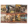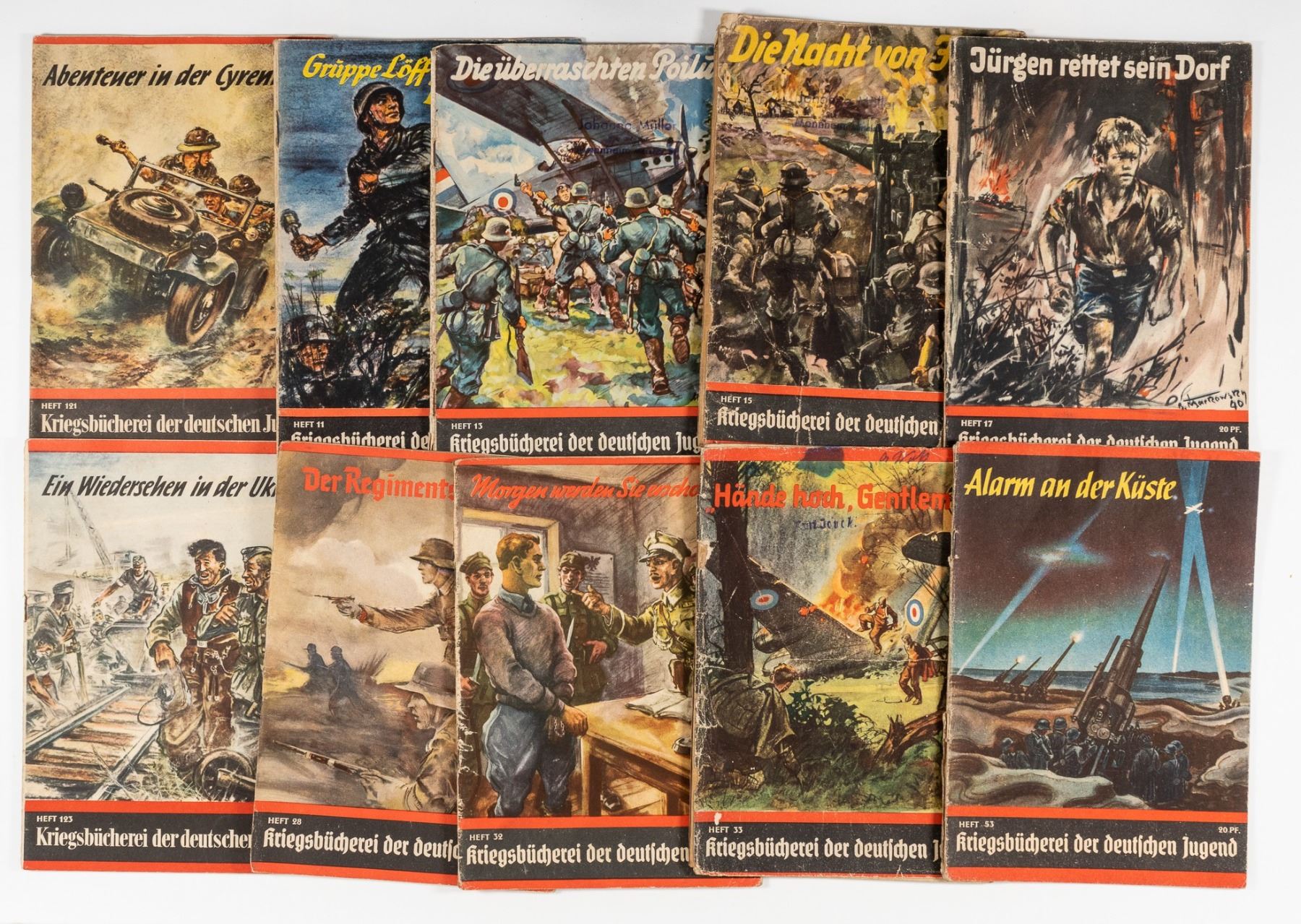 Ten books belonging to the Third Reich children’s book series 'Kriegsbuecherei der Deutschen Jugend' ('War Library of the German Youth'). The lot includes number 11, 13, 15, 17, 28, 32, 33, 53, 121, and 123. They were published at weekly intervals from 1940 through December 1942 and commissioned by Reich Youth Leader Baldur von Schirach for the Hitler Youth. Their purpose was to inspire the youth to join the military. Every book in this set follows an actual event from World War II and has a brightly illustrated cover glorifying the German military cause. 8.25 x 6 inches. Wear from use.