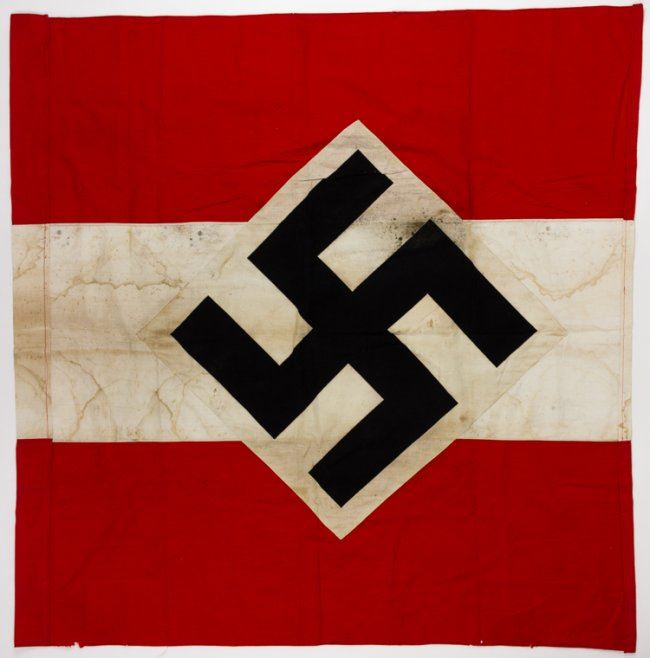 Hitler Youth flag, cotton, 42" x 40", with a sleeve at the hoist side as this flag was meant to be suspended vertically, likely indoors. Some stains, still quite good.