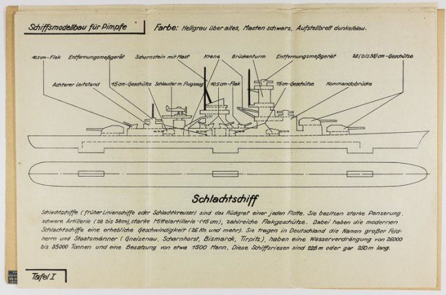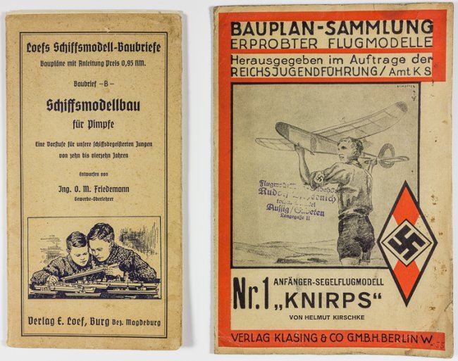 Lot of two sets of plans created for German youths to aid them in making models of German aircraft and vessels, includes an H.J.-authorized 24" x 19" pattern for parts to construct a glider which is shown on the cover of the folder, with instructions, sold with a set of eight plans for nine vessels, ca. 1935, each 1p. legal folio, side views meant to create silhouette models, includes all types of warship, a U-boat, and Hitler's yacht, the Aviso Grille. Some soiling to both sets, the contents very good.