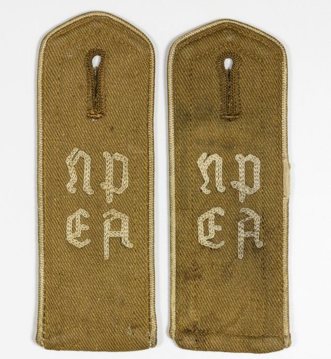 Rare, early H.J. straps issued to an N.P.E.A. (National Political Education Institute) student. The boards are 4 ?" long, 1 ?" wide, brown cloth with beige piping, embroidered with the letters of the organization. One strap bears a complete RZM paper tag on the underside. Unissued.