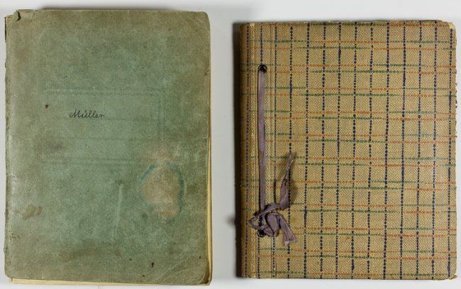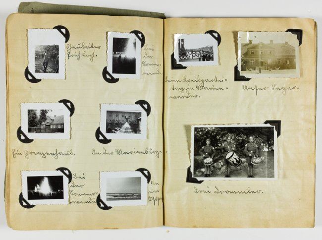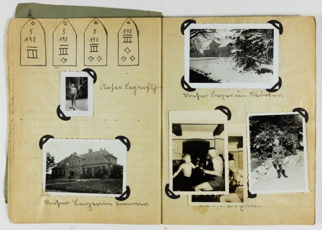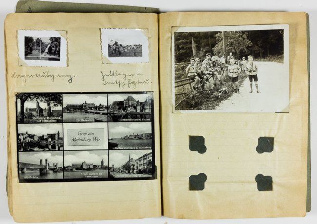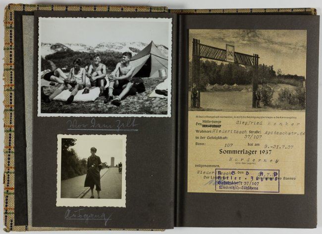 Group of two photo albums, containing photographs depicting members of the "Hitlerjugend" Includes a notebook, 6 1/2"x 8 1/2", containing 130 b/w photos. The book bears the title "Landjahr 1935" ("Agricultural Year 1935") indicating that the owner participated in a year-long community service program with the Hitler Youth in that year. The photos depict Hitler Youth and "Deutsches Jungvolk" members engaged in agricultural training, camping, swimming, boxing, parades, hiking, and trips to various landmarks, including the Tannenberg Memorial. Hitler Youth drums, flags and uniforms are prominent in many of these images. Several pages of journal entries are present at the introduction of the album. The front cover has separated from the notebook, else very good. WITH: Album, 7"x 8", containing 17 b/w photos, all depicting a Hitler Youth summer camp in 1937. The photos are mainly group portraits of Hitler Youth members at the campground, in uniform and in casual clothing, many of which are labeled. Also present are the owner's camp identification card, train ticket, and a postage stamp from his camp. The album's covers are patterned cloth. Very good.
