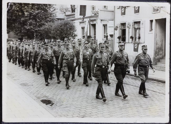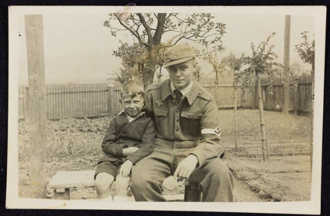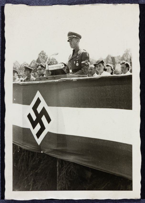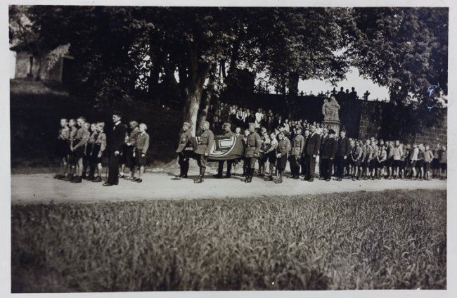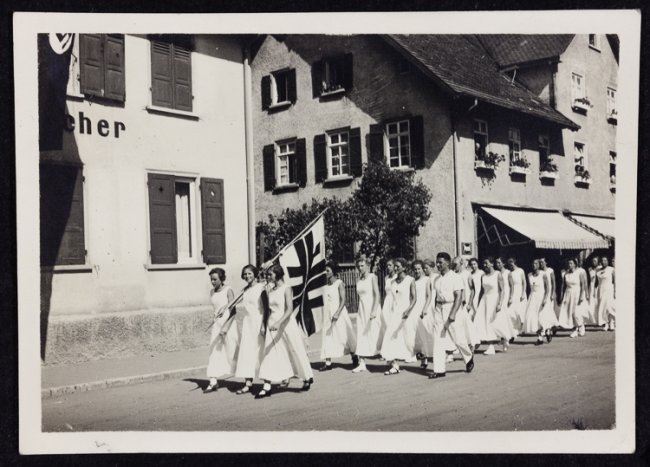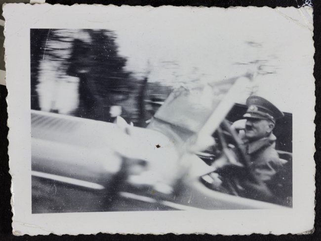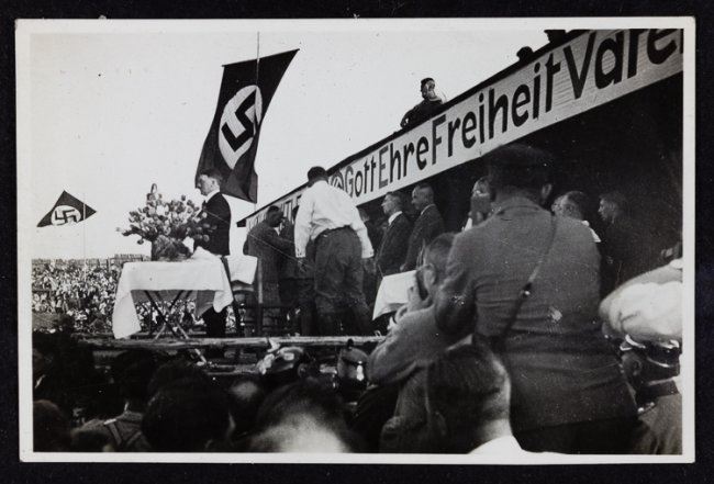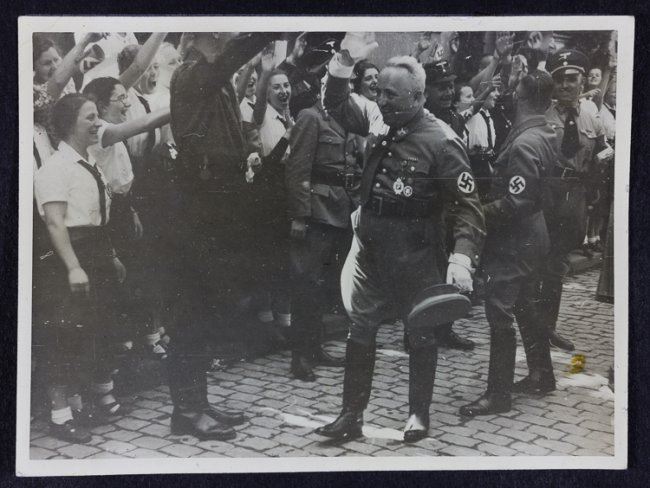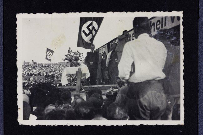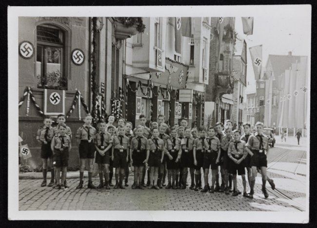 Photo album, 9 1/2"x 12", containing 134 b/w photos and photo postcards, mostly depicting members of the Hitler Youth, the "Deutsches Jungvolk" (German Youth), and the "Bund Deutscher Madel" (League of German Girls), as well as the Wehrmacht. The front cover is decorated with paper dolls depicting a Hitler Youth member and an SA soldier, as well as a metal shield with an eagle and swastika. The photos depict numerous Hitler Youth activities, including rallies, drills, parades and a soccer match. A large variety of Hitler Youth uniforms and equipment are featured, including flags, drums and trumpets. Interestingly, three unpublished snapshots of Adolf Hitler are present, two showing him at a rally, clad in a civilian suit and tie, and one in the back of a car. Also pictured is an Army artillery demonstration, groups of BDM members, and individual portraits of German youth in the uniforms of their respective organizations. Several photos have come loose from the page, else very good.