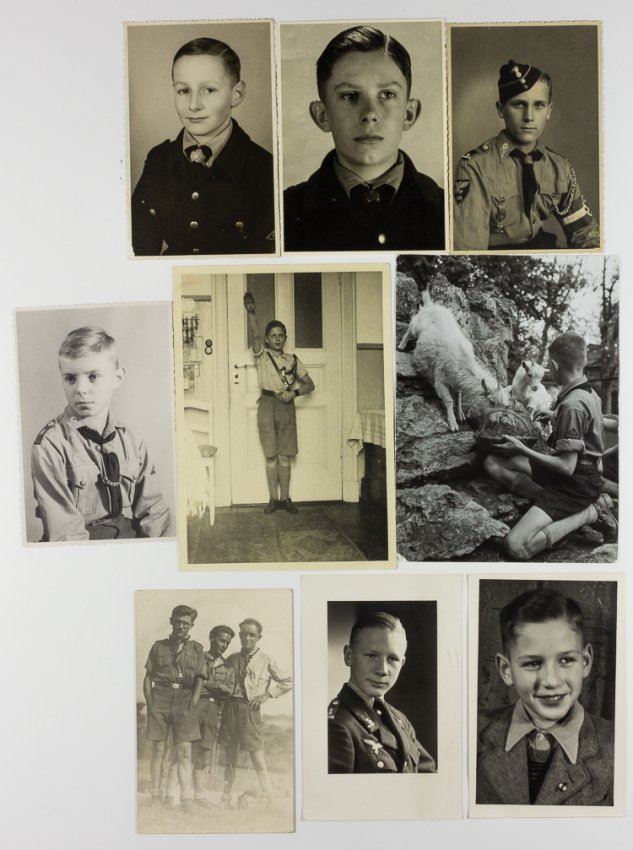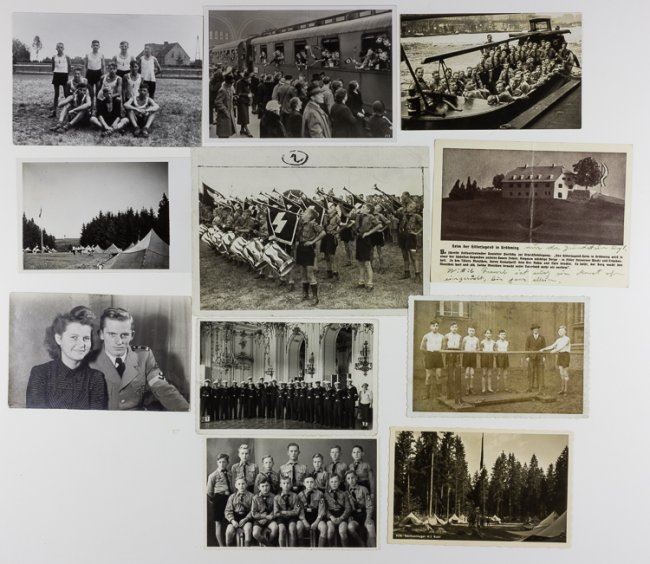 Collection of 16 better quality H.J./ D.J. photos and photo postcards, all 3 ?" x 5 ?" in general Subjects include professionally photographed portraits, group photos including young children "saluting", drummers and trumpeters, camping, etc. Very good.